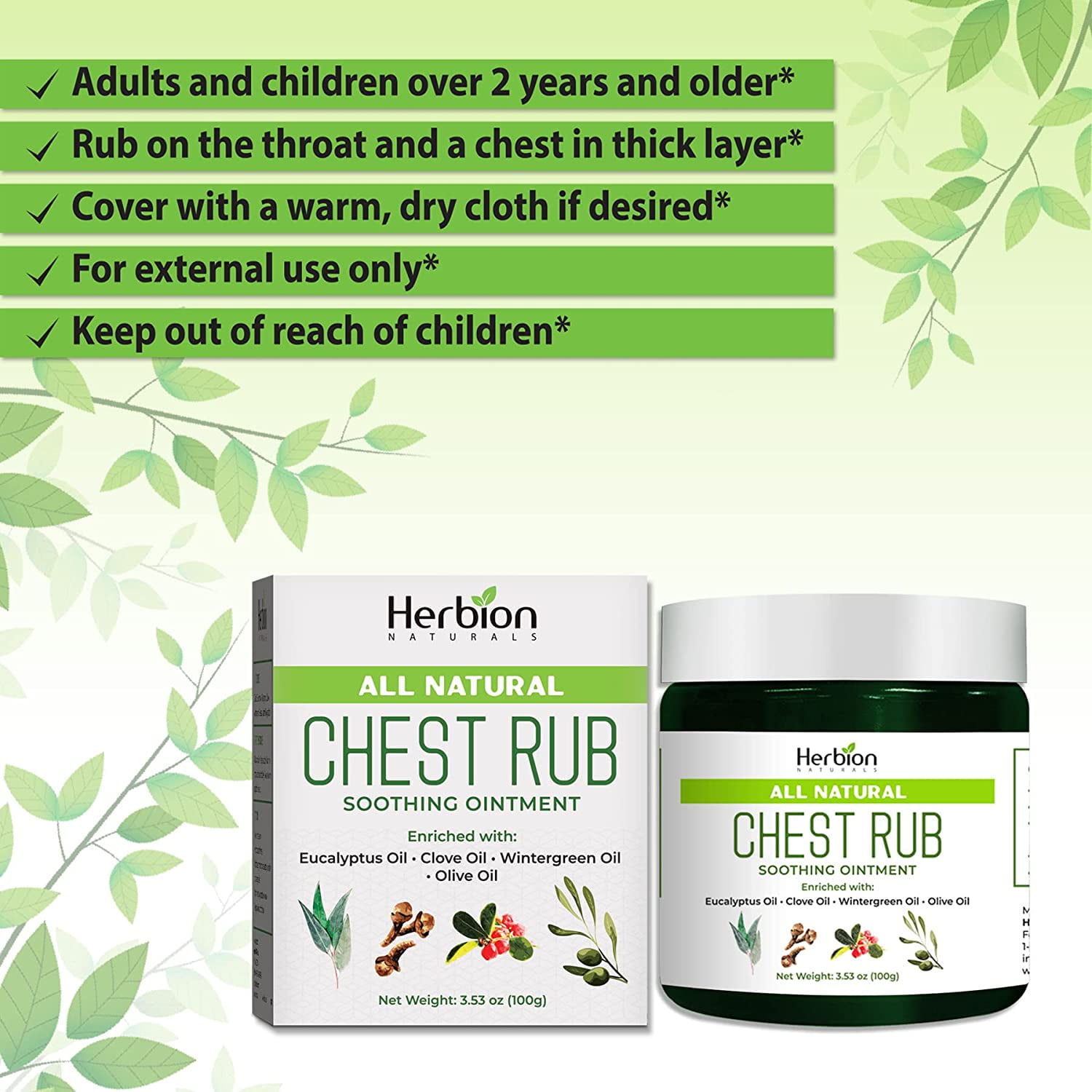 Herbion – All-Natural Chest Rub Soothing Ointment – 3.53 oz. (100g) Herbion All-Natural Chest Rub Soothing Ointment is an ointment that contains the optimally balanced blend of carefully selected oils which provide the synergystic soothing effect.