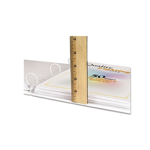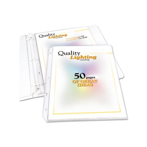 Reclaim your work area by clearing catalogs, magazines, software manuals and more off of your desktop and into three-ring binders Using the High Capacity Sheet Protector to organize a binder is a helpful way to store a lot of paperwork in a compact space. Stores up to 50 letter-size pages. Clear, heavyweight polypropylene material is acid-free, which eliminates photocopy transfer. Three-hole punched. Strong, reinforced binding edges eliminate tearing. The capacity of the holders make it possible to group together large reports or notes without taking up much binder space. Load Orientation: Top Sheet Capacity: 50 Sheet Protector Type: Ring Binder Insert Size: 8 1/2" x 11".