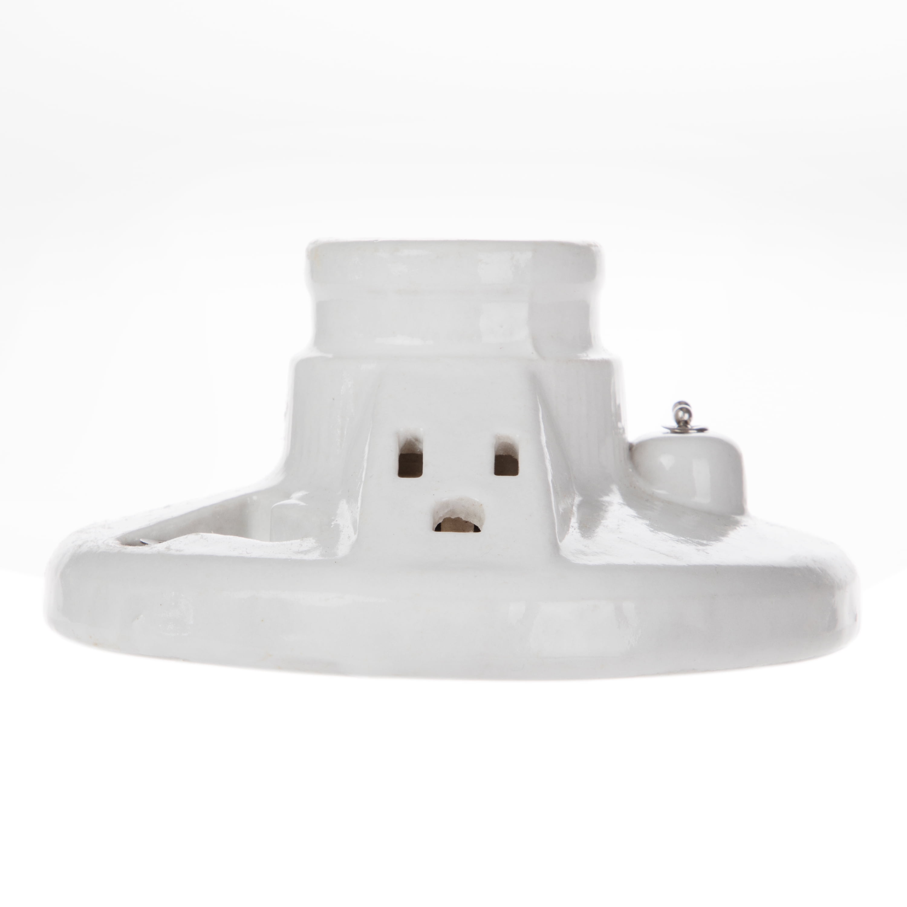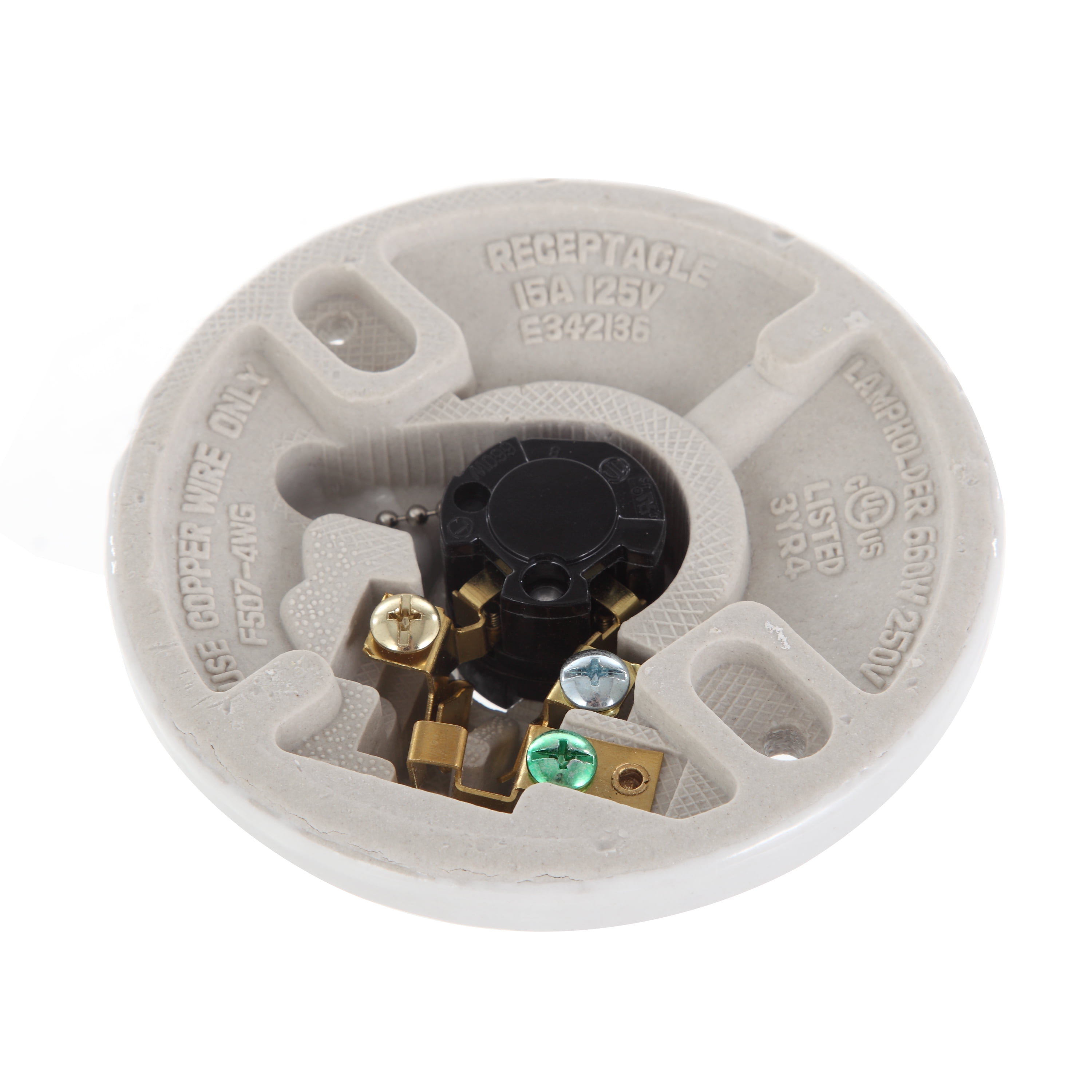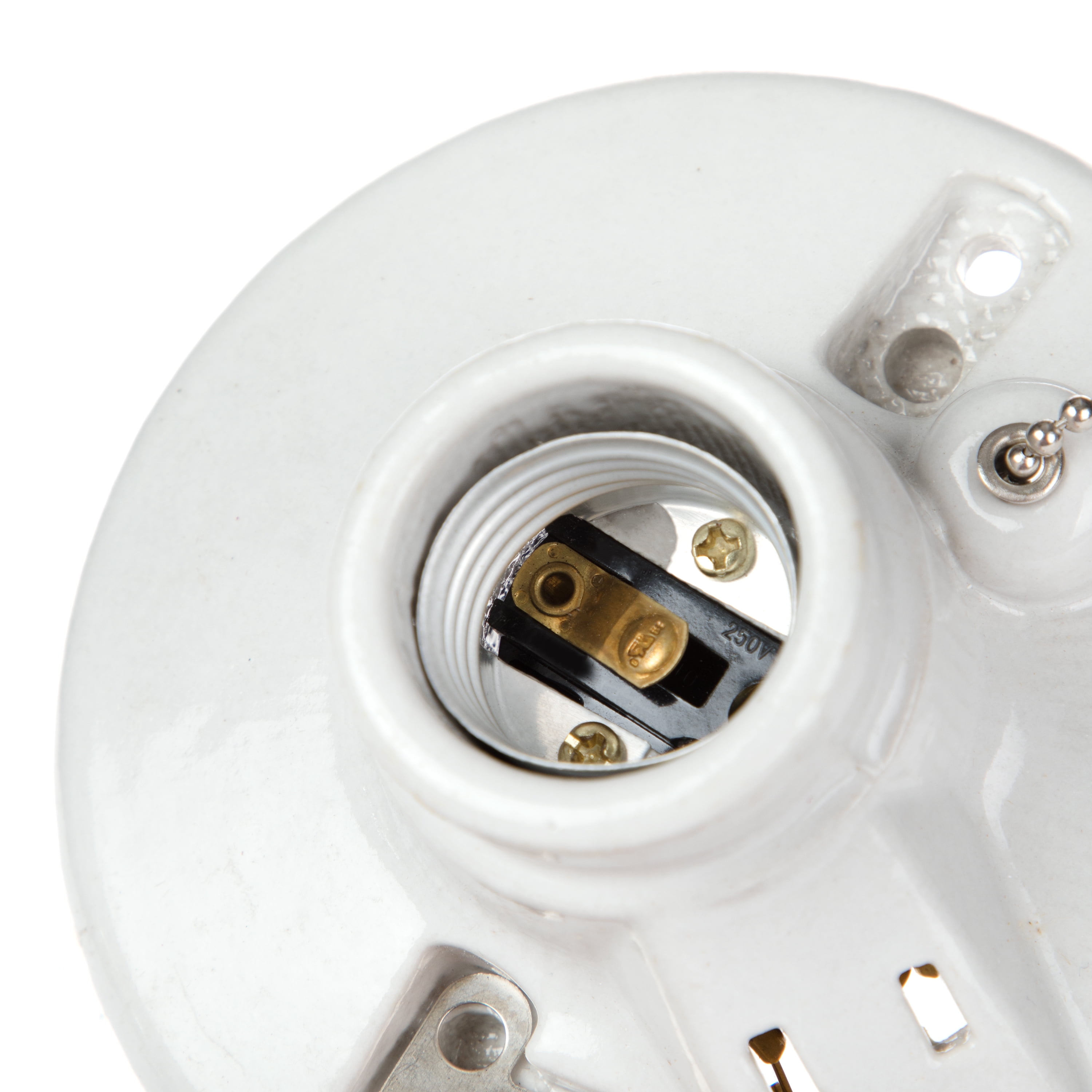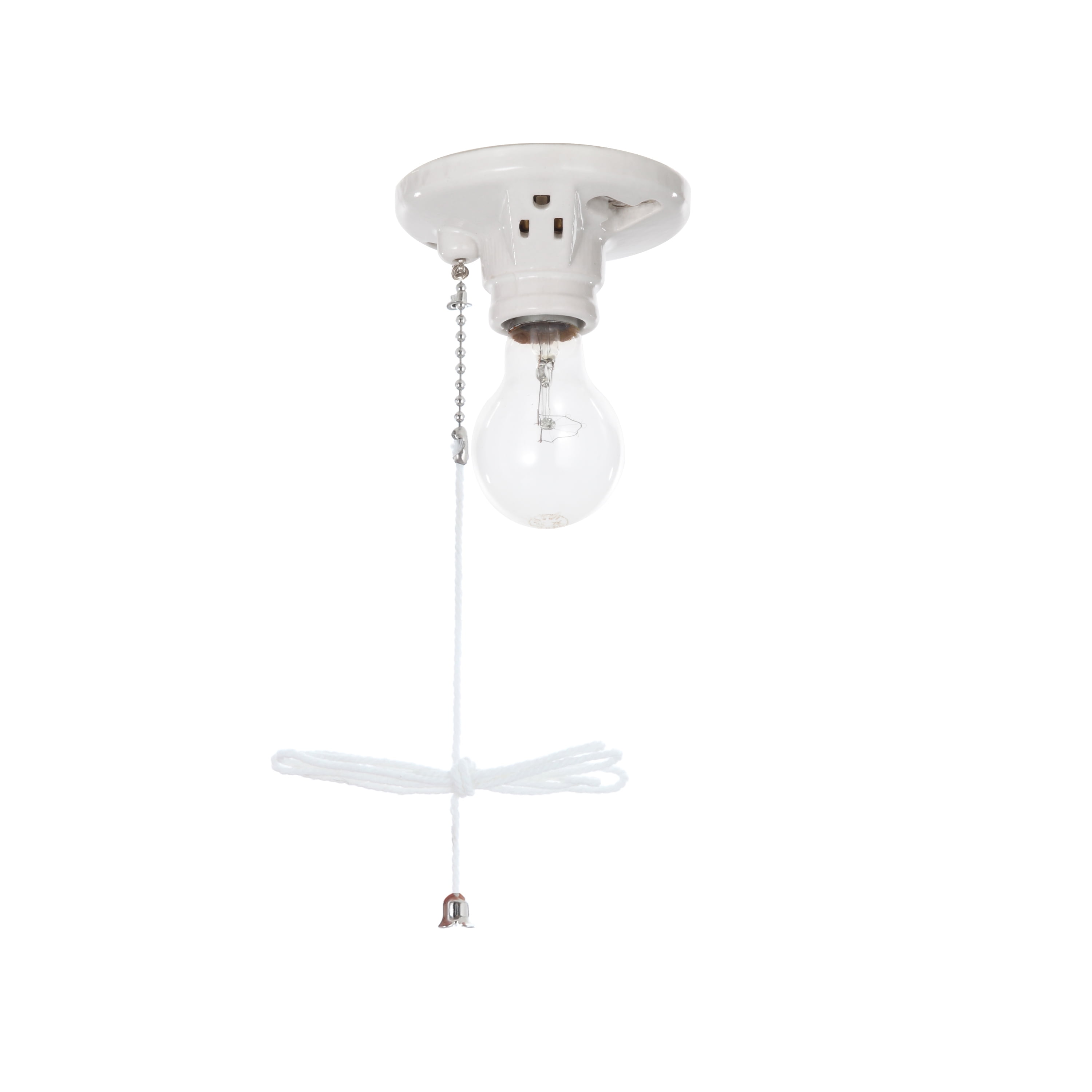 This HyperTough TD35080G Porcelain Pull Chain Lamp holder with socket is a great addition to basements, closets, and rooms. This item is suitable for indoor use only, twist lock mounting, use with a standard wall switch. It has an easy pull chain operation, along with an outlet to connect additional electrical items. Lamp holders include incandescent medium base, and specialty sizes and fluorescent lamp holders. It includes a pull chain to create ease when turning on the light. 3 1/2 center to center holes. Uses one 60 watt max medium base bulb. You could mount it on the ceiling or on the wall. It comes with a beaded pull chain with pull string, white ceramic providing it with a clean look. It is great for matching any home decor and is a perfect addition to any home remodel. Please note: If you are unsure or uncomfortable about performing this installation, please consult a qualified electrician to install this item.