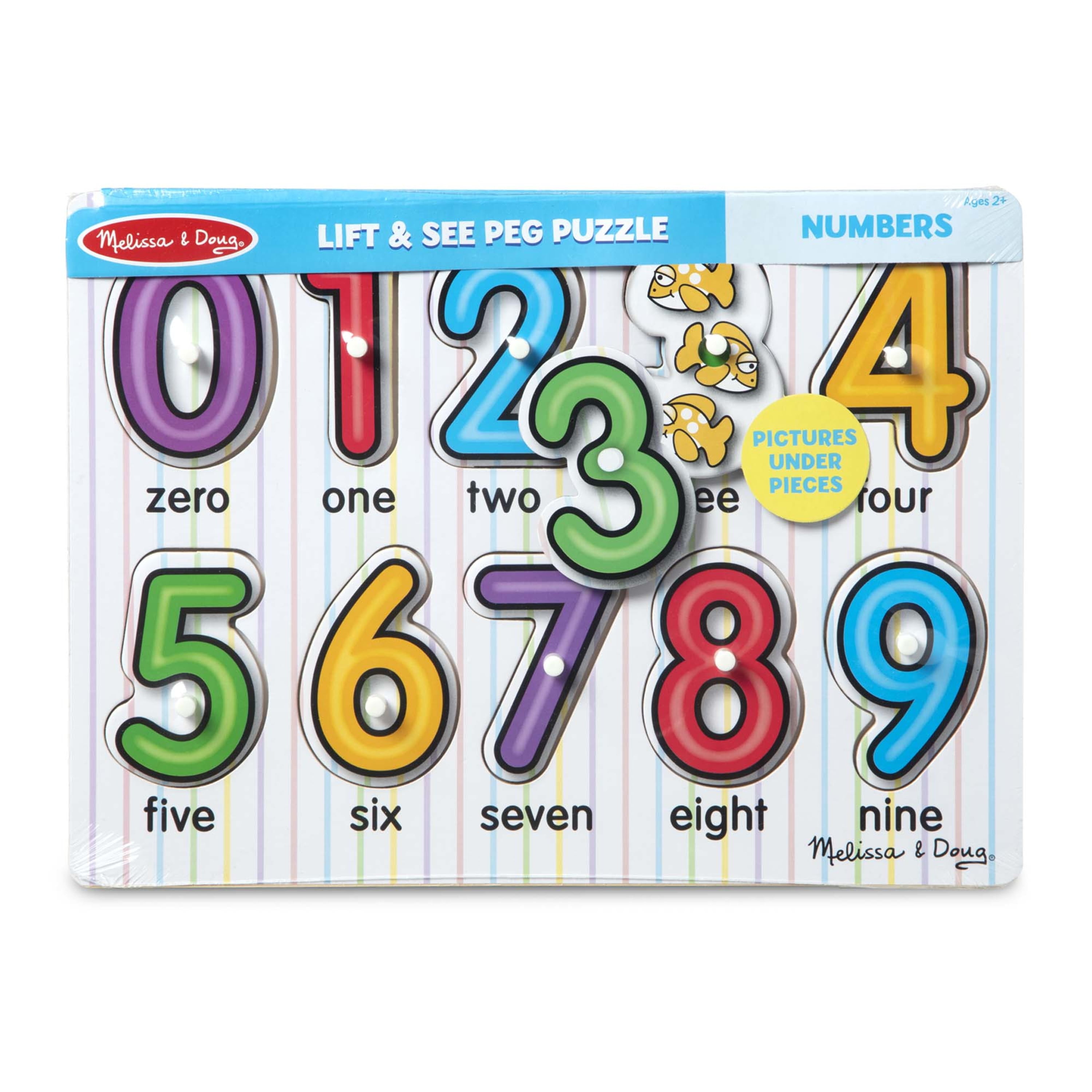 Number concepts, zero through nine, are illustrated in this 10-piece peg puzzle. A colorful picture under each piece shows the same number of items as the numeral on top of the piece, helping promote number recognition and counting skills! Encourages hand-eye, fine motor and visual perception skills.