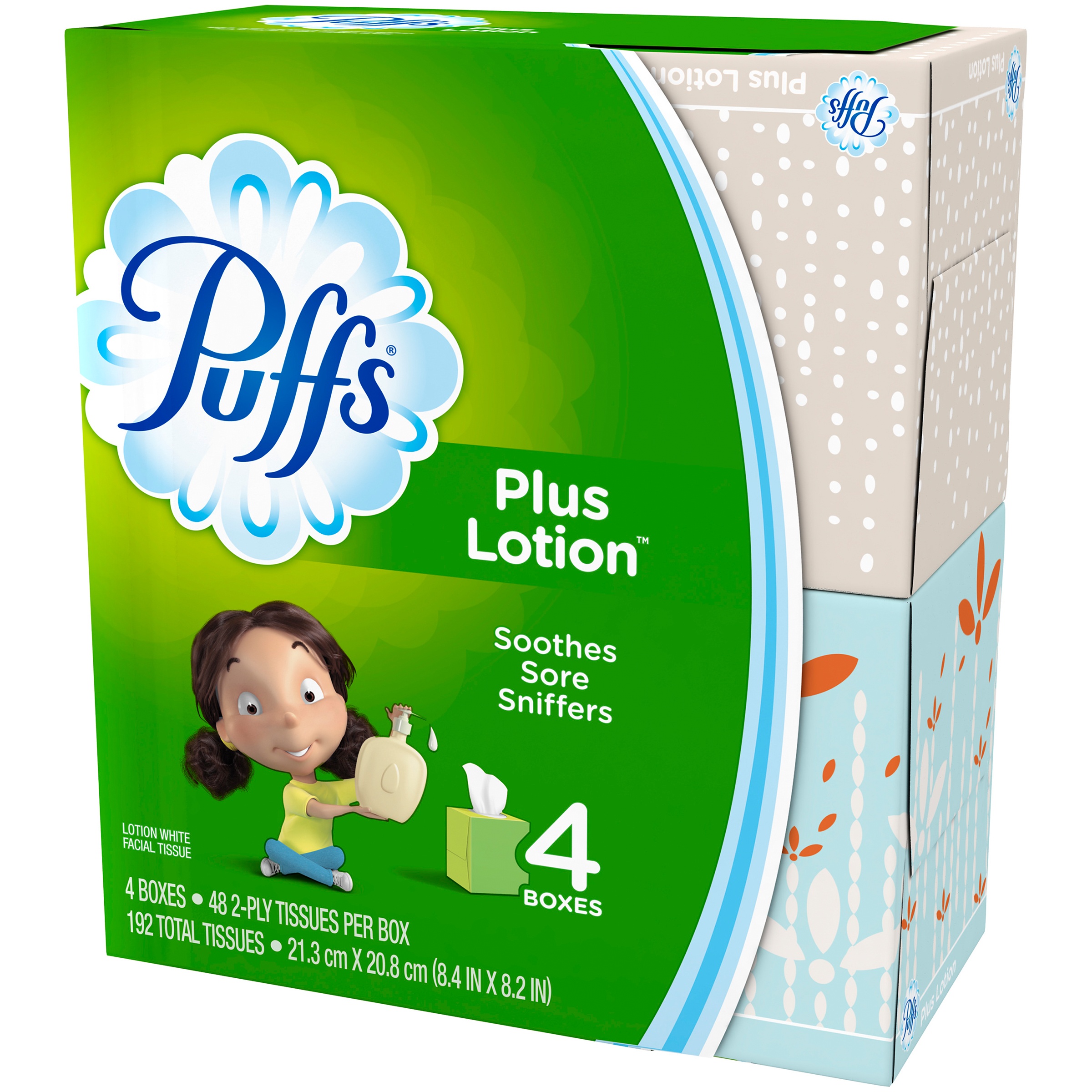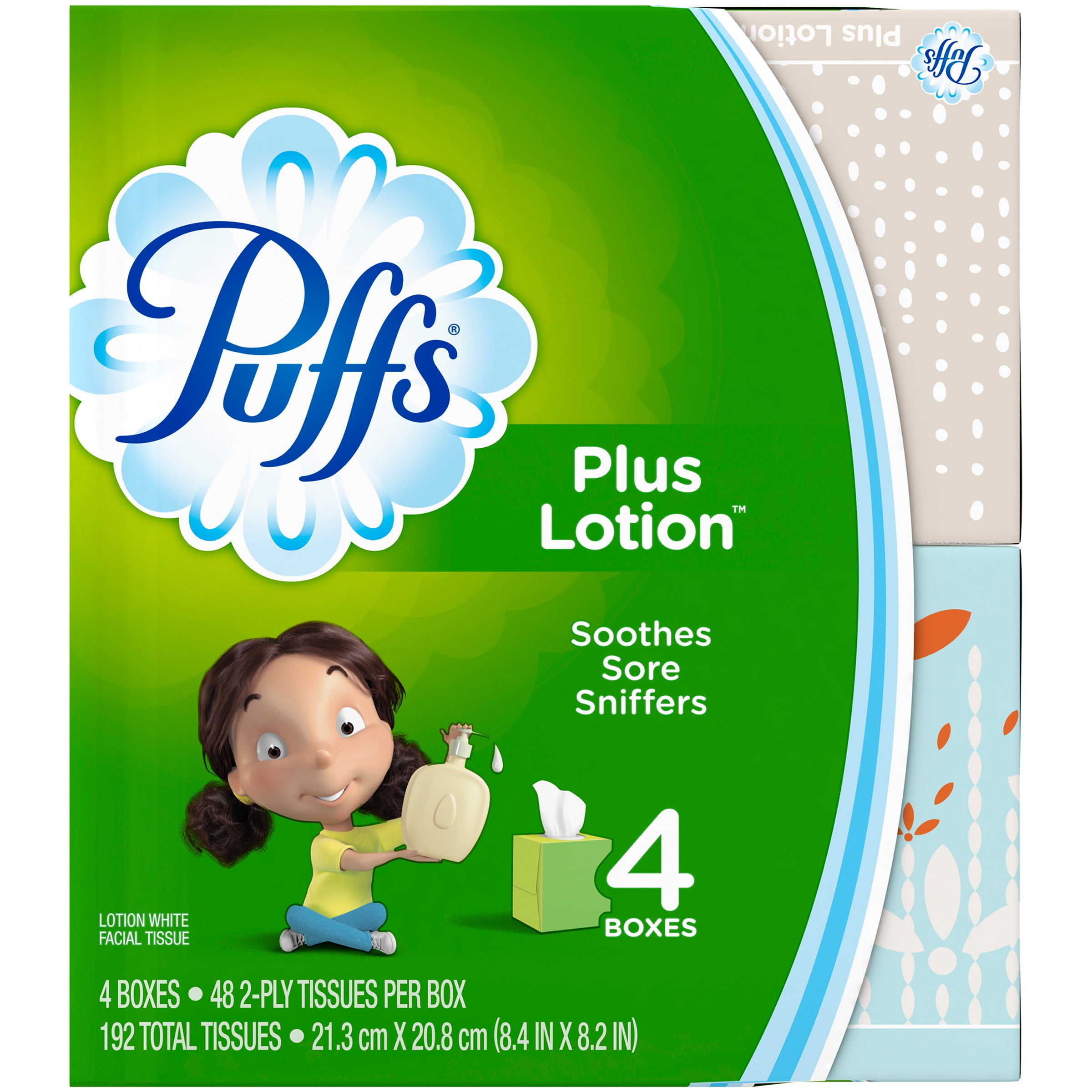 - Pack includes 4 Cubes (48 Tissues per Cube) of Puffs Plus Lotion Facial Tissues