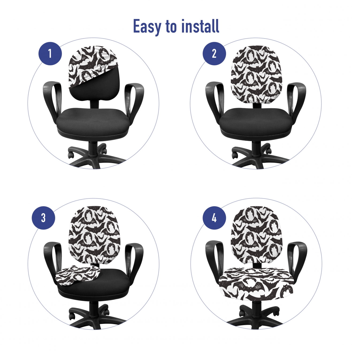 Ambesonne Office Chair Slipcover, Protective Stretch Decorative Fabric Cover STANDARD SIZE – 2 Piece cover set. BACKREST COVER: fits 13.5" to 17.5". SEAT CUSHION COVER: 13.5" to 17.5". FEATURES – Easy to install. Has ties to fasten the seat cover. For seat & backing of the office chair. MADE FROM – %95 polyester %5 spandex lightweight knit fabric. Stretchable, protective printed cover. MACHINE WASHABLE – On cold cycle, tumble dry on low. Soft and breathable, durable cover. No fading. PRINTED – With state of the art digital printing technology. ONLY CHAIR COVER, CHAIR IS NOT INCLUDED. Add fun to your office time! Cover tear, rips and tattered edges of your old chair. It’s easy to install and remove with smart elastic design. Protective and non-slip cover fits universal standard size office chairs. The material is lightweight, thin but durable. It’ll add the ultimate style to your gaming chair or studying area. Set assorted modes for every season; summer, Christmas, St Patrick’s Day, Valentine’s Day, Autumn, Sports Week and any theme you can imagine… Just pick your favorite from our thousands of various patterns. Also, these office chair covers are easy to take care of; machine washable, tumble dry on low. Or just buy one to make your day! This anti-dust desk chair seat cushion protector adds personality to your space as well as shields from scratches, spills, and accidents. Elastic edges secure the cover quickly. With its stretchable design, it fits square or round seat cushions and backings of simple standard office chairs. These protector covers can be a gift for your co-workers, mother, father, uncle, aunt, son, daughter, boyfriend, girlfriend, husband, wife or simply white-collar worker friends and students. Before purchasing, please measure your chair size. The digital images we display have the most accurate color possible, however, due to differences in computer monitors, we cannot be responsible for variations in color between the actual product and your screen.Autumn Office Chair Slipcover, Scary Bats Sketch Time of the Year Halloween Theme on Plain Background, Protective Stretch Decorative Fabric Cover, Standard Size, Charcoal Grey and White, by Ambesonne