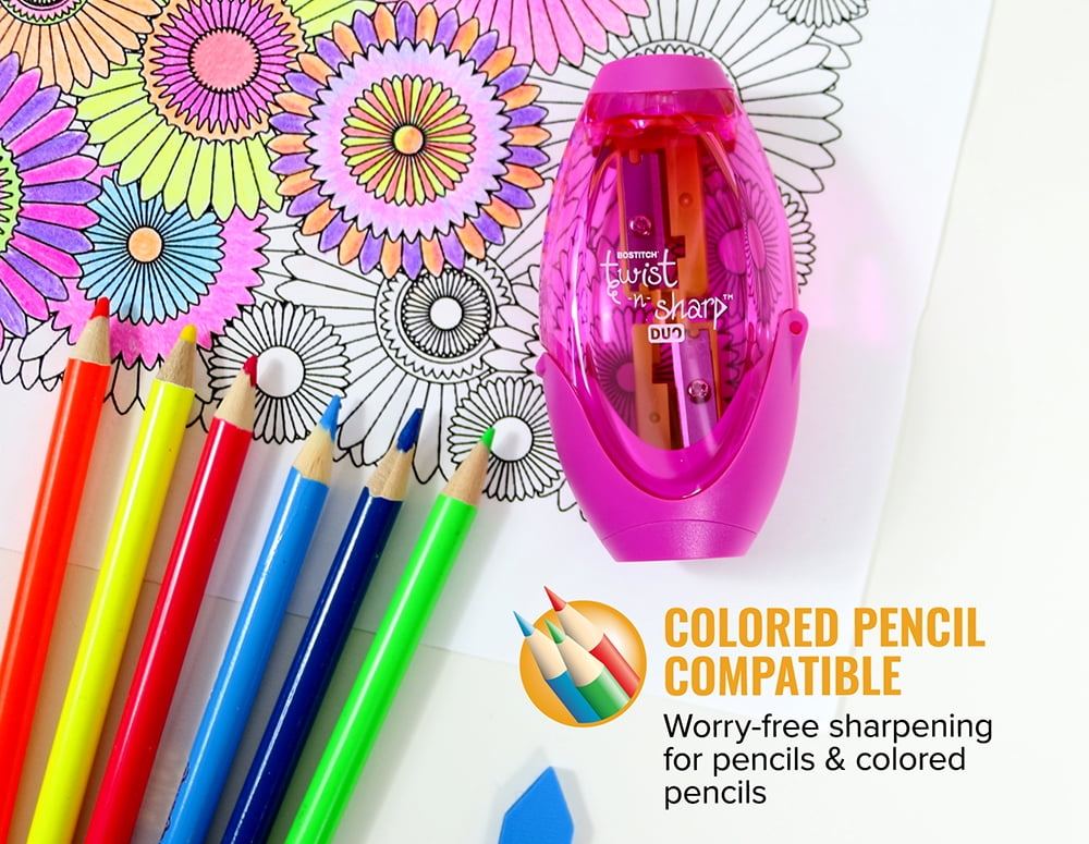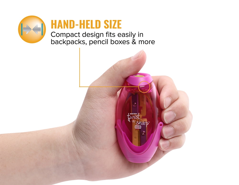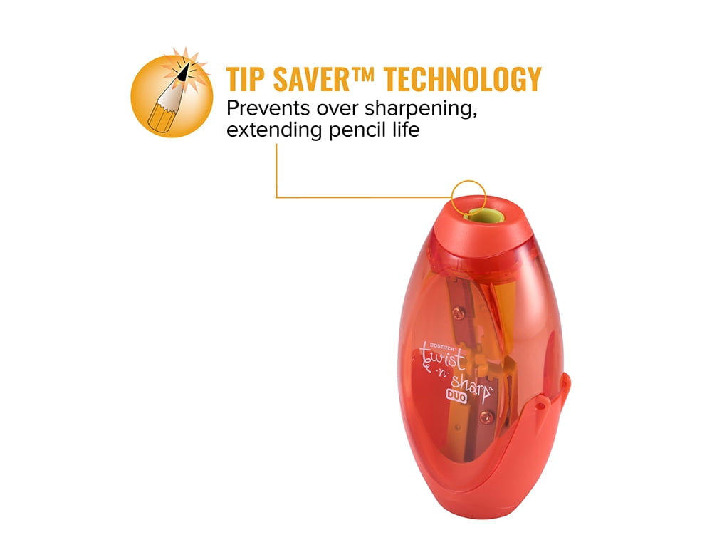 Twist-n-sharp 2 hole Pencil sharpener features ratchet technology in the sharpener for easy sharpening. The ratchet allows for faster sharpening without ever having to Let go of the Pencil of the sharpener. This technology is only offered on stitch premium office supplies. This sharpener also offers the convenience of 2 different sized holes so you can sharpen standard pencils as well as jumbo pencils! so even as your child transitions from learning pencils to standard pencils, your sharpener can remain the same! for products your can rely on, there’s always Bostitch Office!