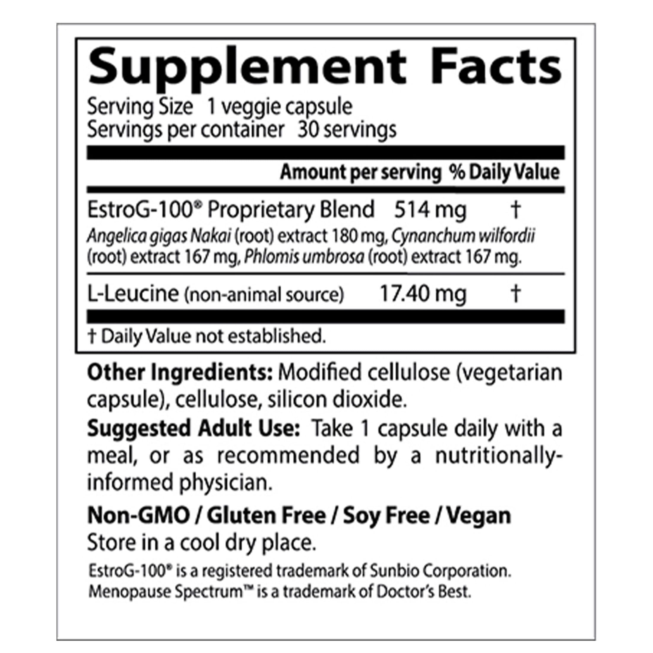 A comforting herbal trio. During menopause, some women may experience symptoms that can disrupt daily life, and Menopause Spectrum with EstroG-100 can help offer comfort. Crafted from a blend of three herbal root extracts (sage-like Phlomis umbrosa, a form of milkweed Cynanchum wilfordii, and Angelica gigas Nakai), EstroG-100 can help manage hot flashes, night sweats, nervous irritability, dizzy spells, vaginal dryness, numbness and tingling, occasional emotional discontent, and occasional fatigue associated with menopause.* At Doctor’s Best, we lead with science. Our products are backed by research and crafted using pure ingredients carefully sourced from around the globe. Since 1990, we have dedicated ourselves to providing highly effective nutritional supplements that enable you to live a healthier lifestyle. We want nothing more than to see you and your family thrive!