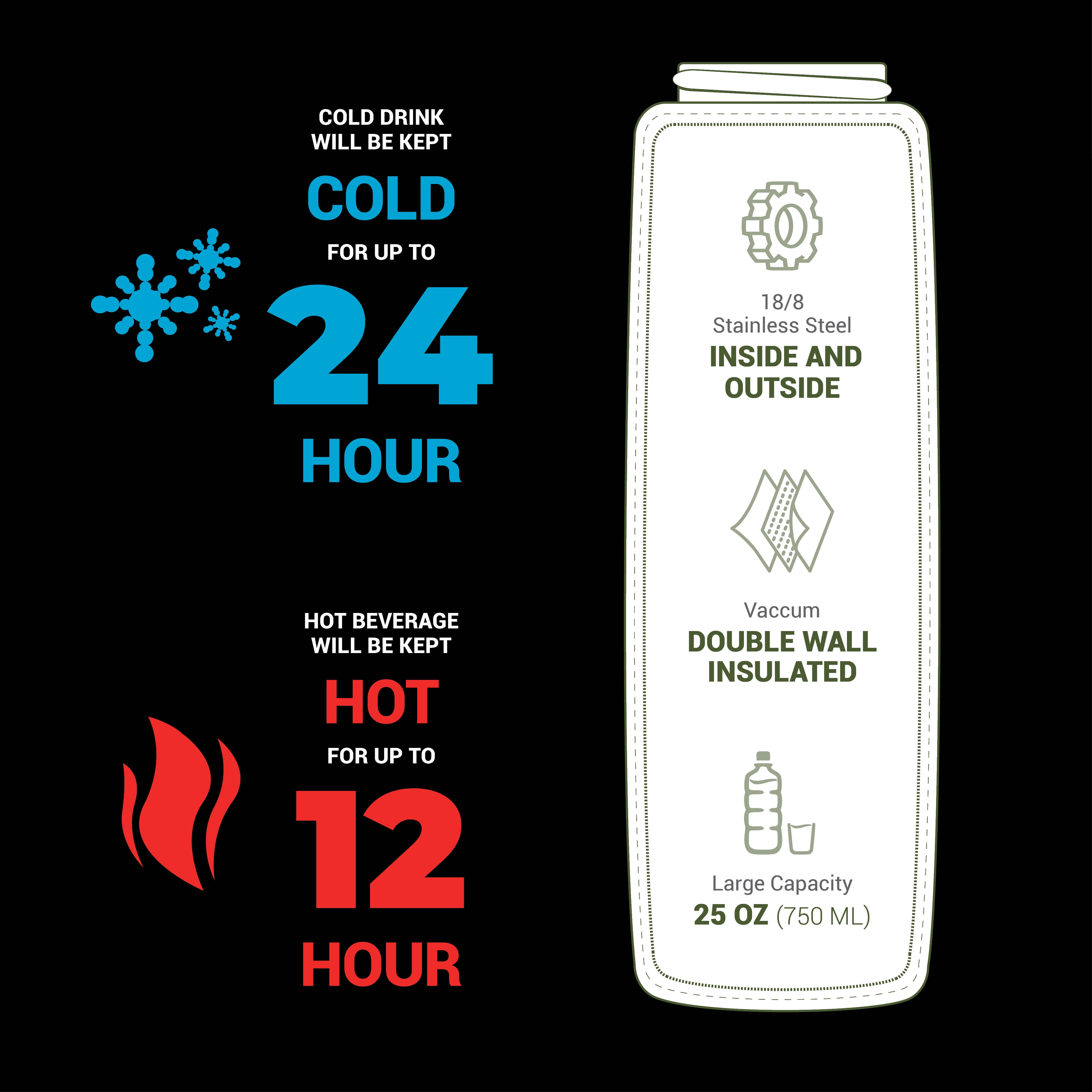 - The double wall-this rustic grained sienna bottle is crafted with double walls, the only bottle out there with inside and outside stainless steel. Beverages will be kept hot for up to 12 hours and cold for up to 24. The double-wall feature prevents condensation and burns, retaining the temperature of your beverage.