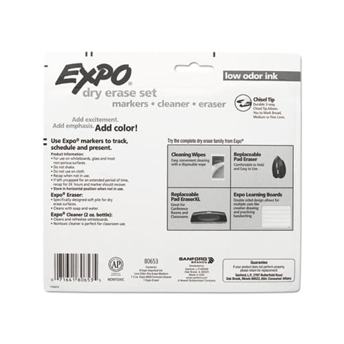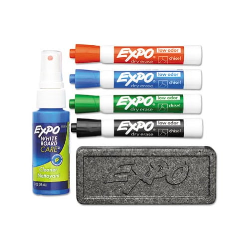 Expo Low Odor Dry Erase Markers Starter Set has everything you need to get started working on your whiteboard. The set includes an eraser, cleaning spray and colorful whiteboard markers. The dry erase markers feature bold ink thats easy to see from a distance and provides consistent color quality. The dry erase marker ink is specially formulated to be low-odor making it perfect for use in classrooms, offices and homes. Use your Expo dry erase marker kit to track, schedule and present. Marker Ink Type: Dry Erase Marker Tip Type: Chisel Marker Tip Size text: Broad Marker Colors: Assorted.