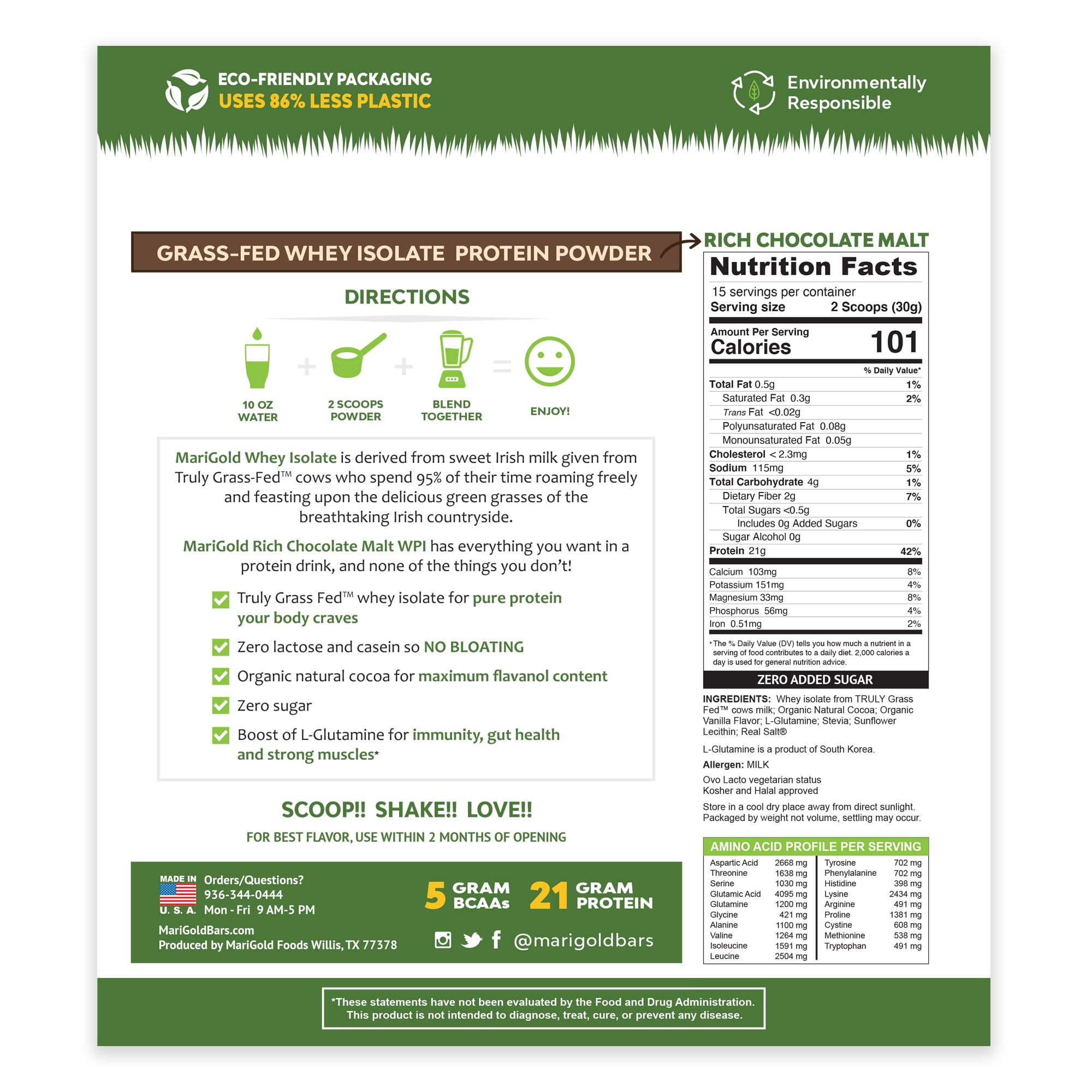 MariGold Grass-fed Rich Chocolate Malt Whey Isolate Protein Powder (1LB Bag) is a complete protein source and is derived from sweet Irish milk given from Truly Grass Fed cows who spend 95% of their time roaming freely and feasting upon the delicious green grasses of the breathtaking Irish countryside. Our Grass-fed whey isolate protein powder is cold processed and micro-filtered, leaving it UNDENATURED and incredibly creamy. Whether you’re a body-builder, training for a marathon, busy running your own business, or simply on the go and getting things done, you can always rely on a delicious, smooth & creamy protein boost to feel your best and take on the world. It is EASY TO MIX – DRINK IT – EAT IT – BAKE IT! Keep it simple, or get super creative…the choice is yours! No matter if you’re a trained chef, or someone that’s never stepped foot in a kitchen, you can enjoy our protein powder in a variety of ways!