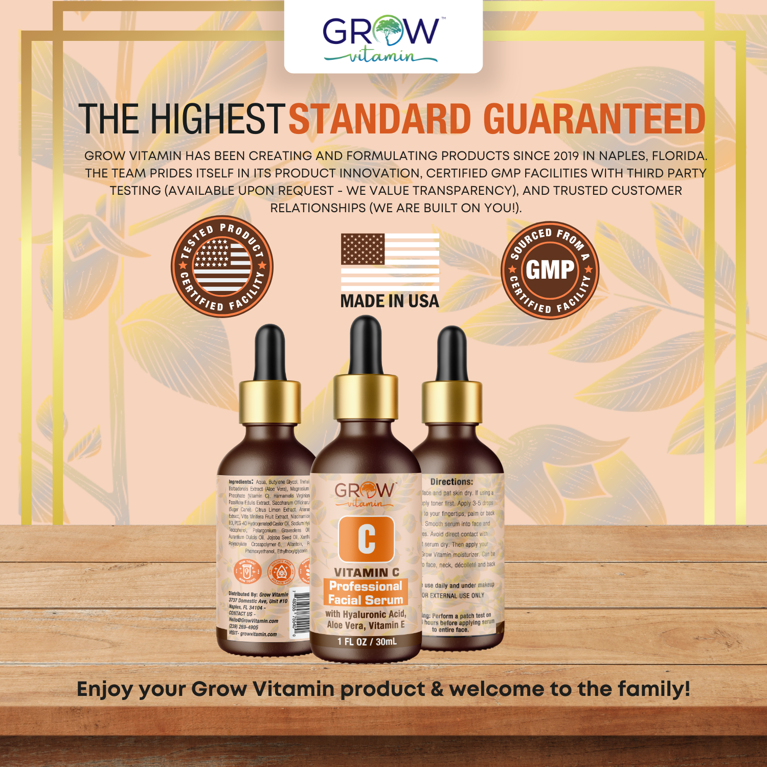 - THE HIGHEST STANDARD GUARANTEED – Grow Vitamin has been creating and formulating products since 2019 in Naples, Florida. The team prides itself in its product innovation, certified GMP facilities with third party testing (available upon request – we value transparency), and trusted customer relationships (we are built on you!). Enjoy your Grow Vitamin product & welcome to the family!
