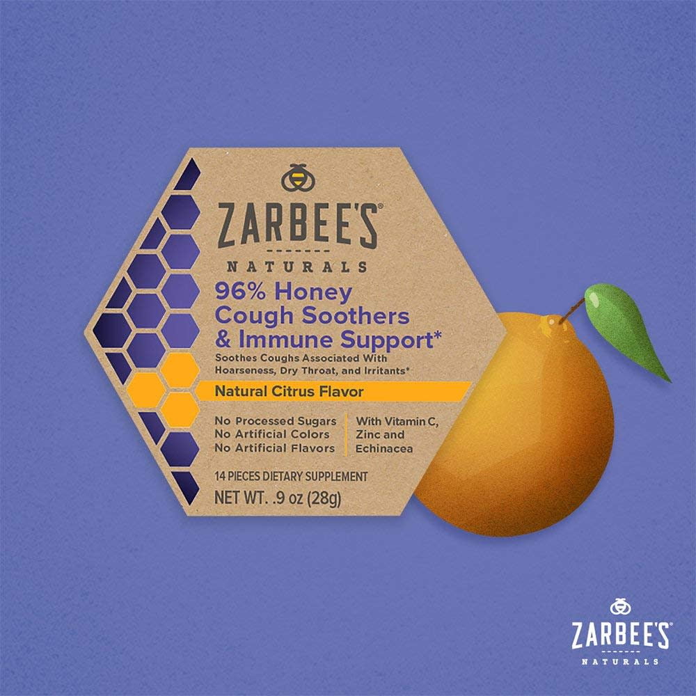 Zarbee’s Naturals 96% Honey Cough Soothers + Immune Support* help soothe your throat and calm coughs associated with hoarseness, dry throat, and irritants*. These cough drops, for children ages 5 years+ have Vitamin C, zinc and natural echinacea for immune support.* Made with honey and agave, these cough soothers have a delightful honey & citrus flavor. You can count on Zarbee’s Naturals for vitamins, supplements, and options to soothe and support your whole hive. Check out our whole line of products made of handpicked wholesome ingredients, and without any drugs, alcohol, or artificial flavors. *These statements have not been evaluated by the Food and Drug Administration. This product is not intended to diagnose, treat, cure, or prevent any disease.