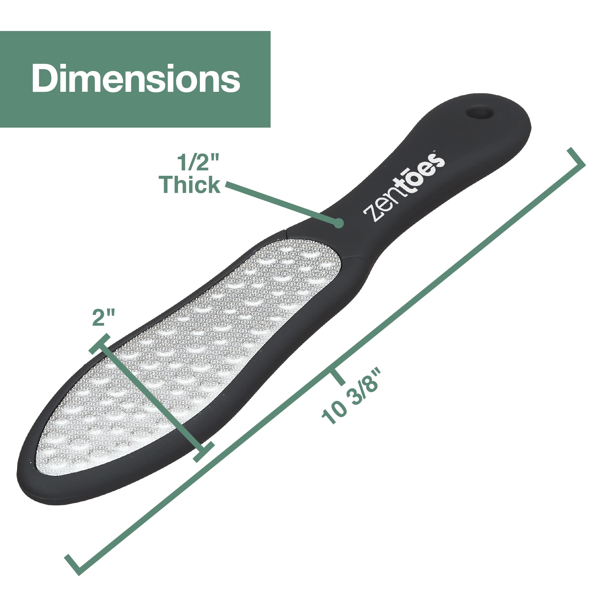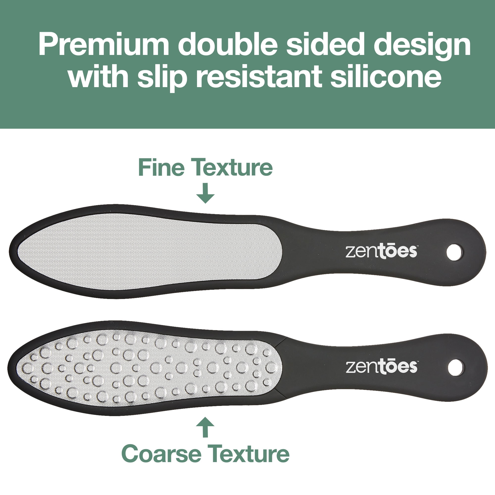 - SALON GRADE FOOT FILE: ZenToes professional quality stainless steel foot callus file has a coarse side for removing calluses and thick, dead skin from your feet and a fine side to leave your skin feeling smooth and soft. Unlike the "pedicure cheese grater" style, our metal file can be used at any angle, in any direction, for hard to reach areas.