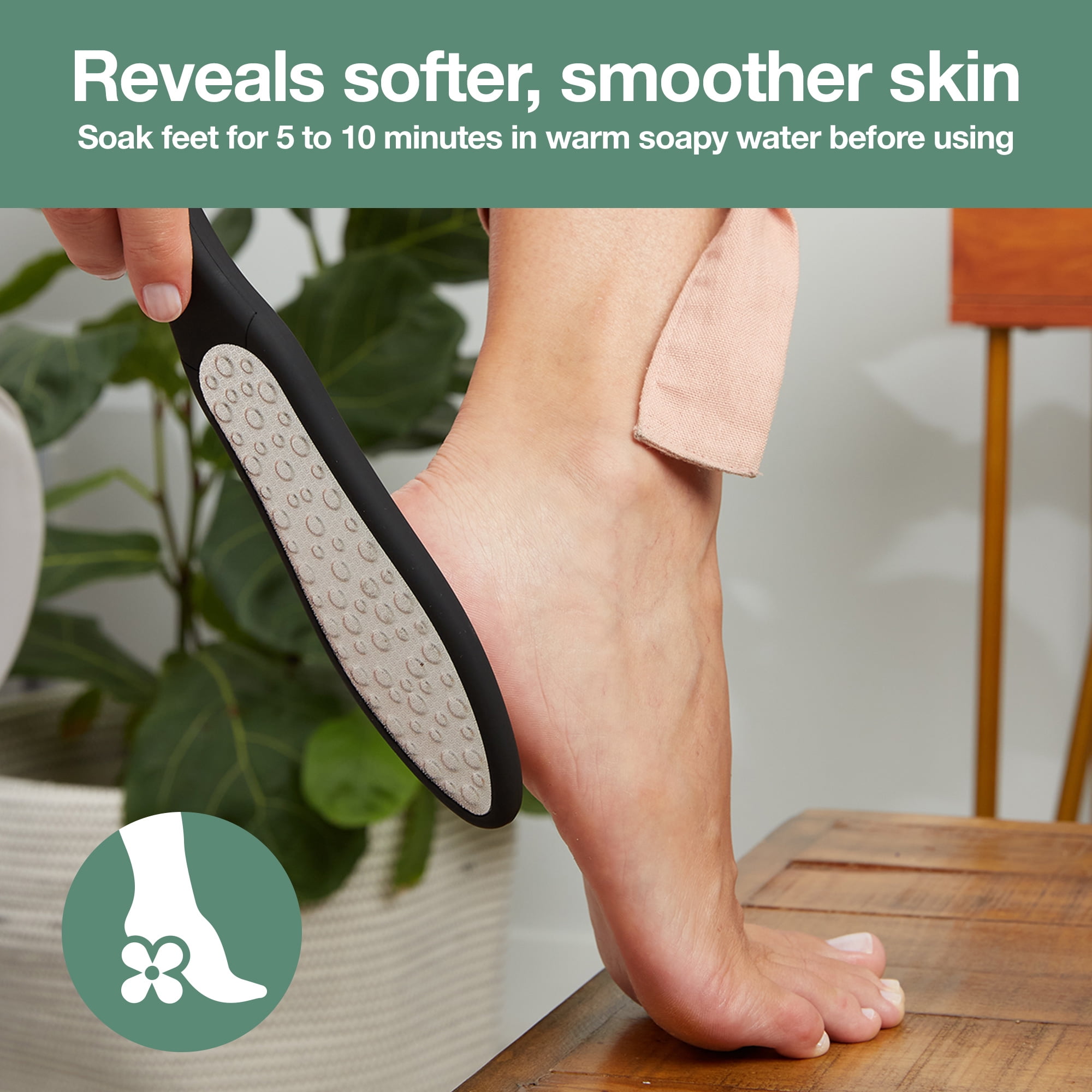 - EASY TO USE: Simply soak your feet in warm, soapy water for 10 minutes or use your heel file at the end of a warm bath or shower. Rub the callus with the coarse side of the skin rasp in a gentle back and forth motion to file away the dead skin. Repeat with the fine side of the grader to smooth away any rough areas. The handle of our metal callus remover is covered in a black, non-slip silicone which makes the foot skin scraper easy to grip while using.