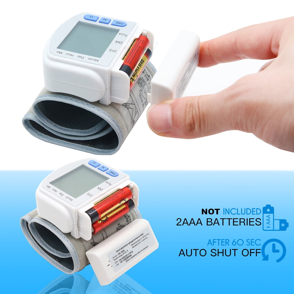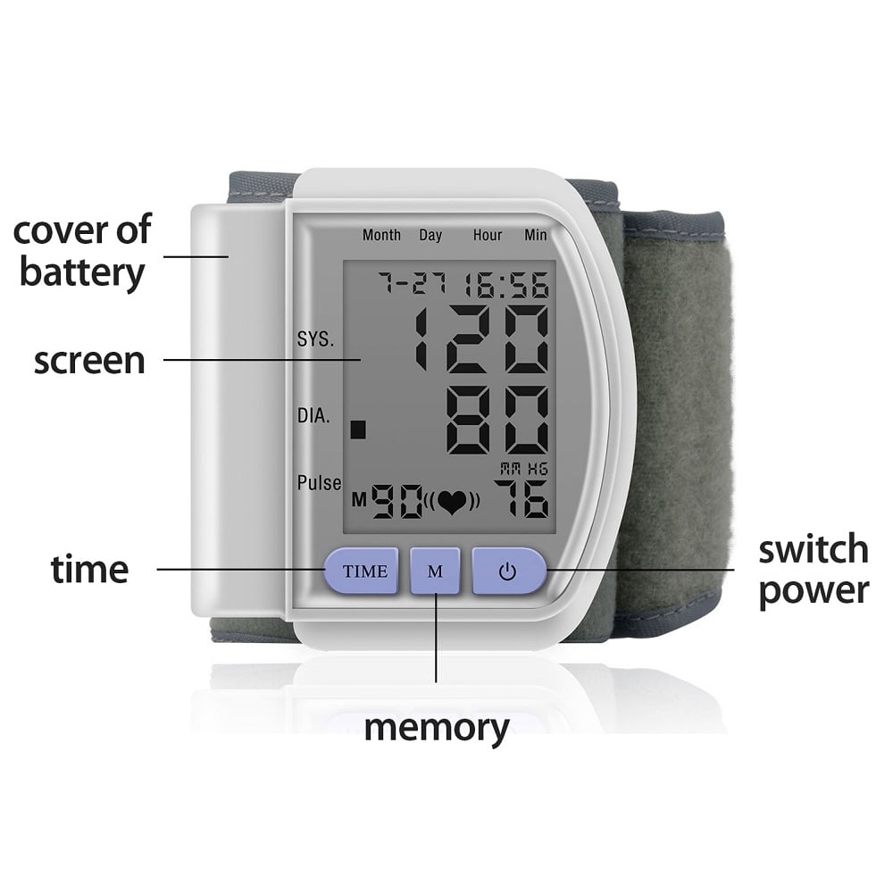 Automatic Wrist Blood Pressure Monitor BP Cuff Gauge Heart Rate Machine Tester. Intelligent simulation test process. Rapidly measure systolic blood pressure, diastolic blood pressure and pulse. Clearly visible large screen LCD digital display. Automatic memory 90 groups measurement results. Intelligent automatic shutdown function. Can be queried sequentially each set of measurement results. Compression method: automatic pressurizing pump. Decompression methods: Automatic decompressurizing pump