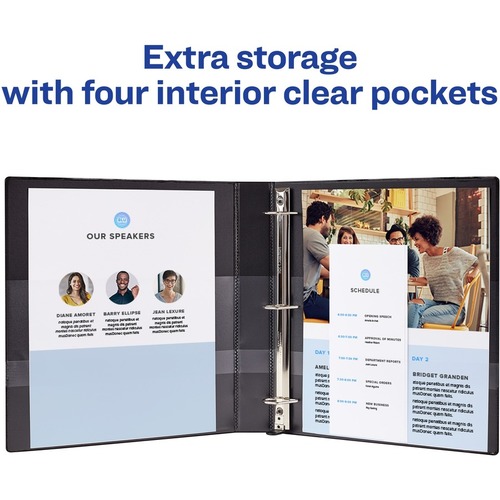 This Heavy-Duty View Binder with One Touch rings is perfect for extended use. From everyday referencing to classroom notes and home business use, -this binder’s strong enough to handle them all. The DuraHinge(R) design is stronger, lasts longer and resists tearing, while the DuraEdge(R) feature makes the sides and top more pliable to resist splitting. Our deep texture film offers a smoother finish and features a linen pattern for high quality look and feel. Just pull the lever to open the rings for adding, replacing and removing pages. Then push to lock the rings in place. Even when filled to its 275-page capacity, this binder still has four stacked pockets for a bit of extra space inside. Customize the black cover with free, easy-to-use templates and designs at avery.com/print. This Heavy-Duty View Binder with One Touch rings is perfect for extended use. From everyday referencing to classroom notes and home business use, -this binder’s strong enough to handle them all. The DuraHinge(R) design is stronger, lasts longer and resists tearing, while the DuraEdge(R) feature makes the sides and top more pliable to resist splitting. Our deep texture film offers a smoother finish and features a linen pattern for high quality look and feel. Just pull the lever to open the rings for adding, replacing and removing pages. Then push to lock the rings in place. Even when filled to its 220-page capacity, this binder still has four stacked pockets for a bit of extra space inside. Customize the black cover with free, easy-to-use templates and designs at avery.com/print. More from the Manufacturer