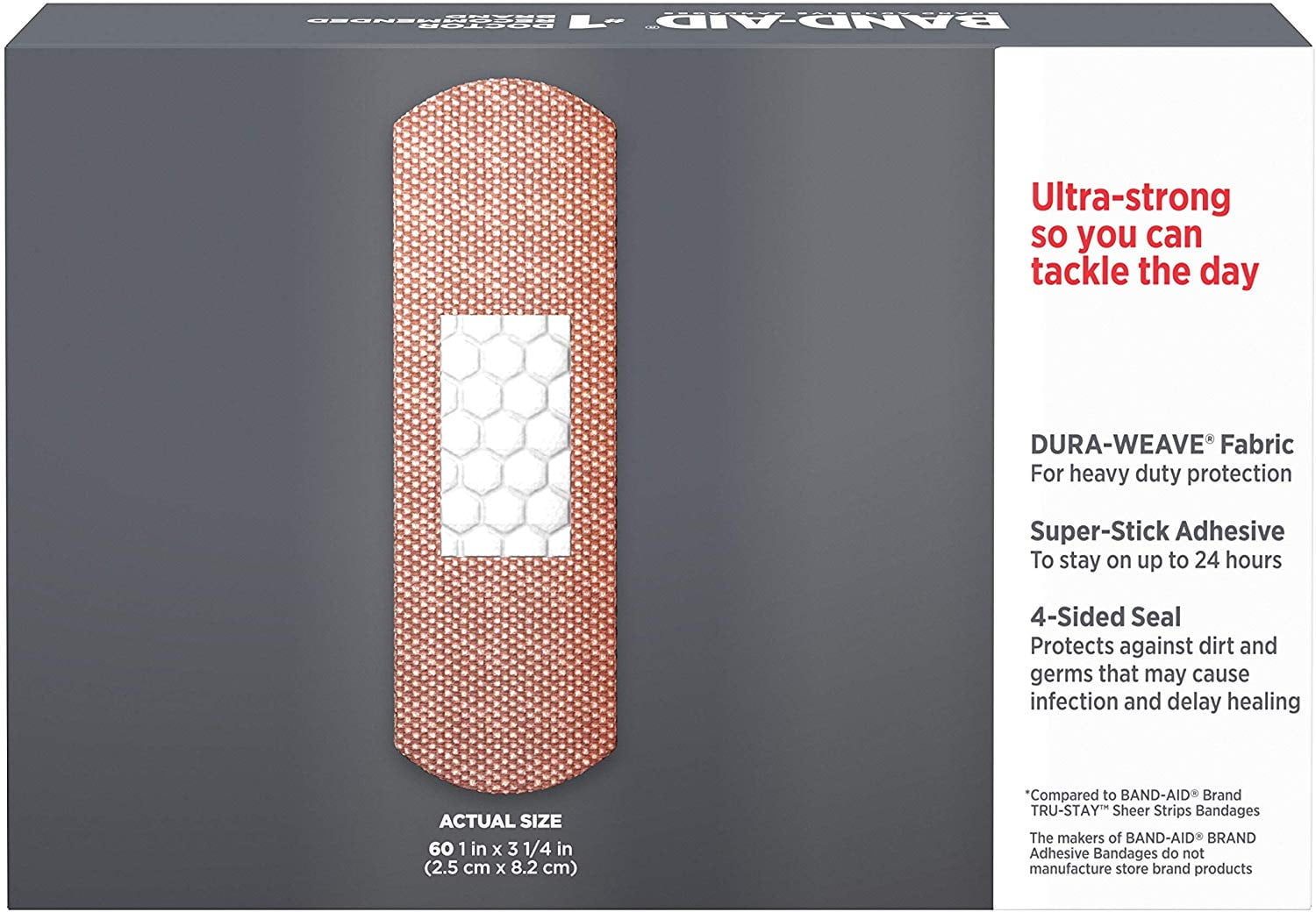 Band-Aid brand Tough Strips adhesive bandages, All One Size, 1" 3" (2.5 cm 8.2 cm), 60 count. BAND-AID Brand TOUGH-STRIPS Adhesive Bandages are designed to cover wounds and provide breathable, all-purpose protection. These sterile pads are made with DURA-WEAVE Fabric and a strong adhesive to provide durable protection. The pad stays in place for long-term wear, yet it’s nonstick for gentle removal. It is not intended for use on sensitive or delicate skin. This package contains 60 sterile bandages.Band-Aid Brand Tough Strips Adhesive Bandage For Minor Cuts & Scrapes, All One Size, 60 Ct