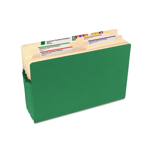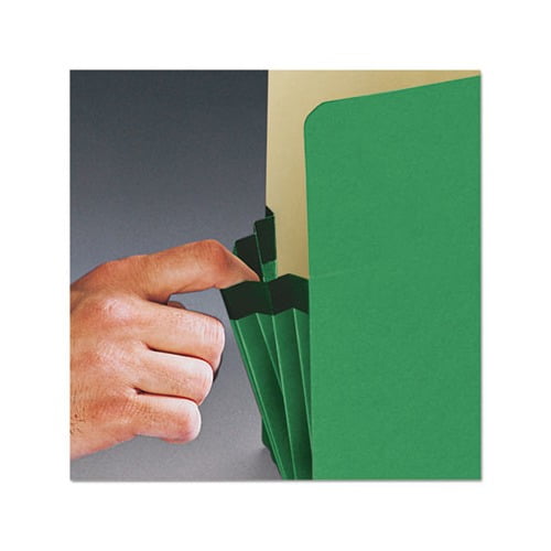 Bright colored file pockets help color-code projects. Rollover gussets reinforced with tear resistant material provides extra strength at critical points. Manila interior makes for easy labeling. Fold-down front for easy access to contents. Bottom and sides fully enclosed for extra security. Pocket/Wallet Type: Files/Papers Size: Legal Overall Expansion: 3.5" Colors: Green. Green : Paper contains 10% post-consumer recycled content, 10% total recycled content.