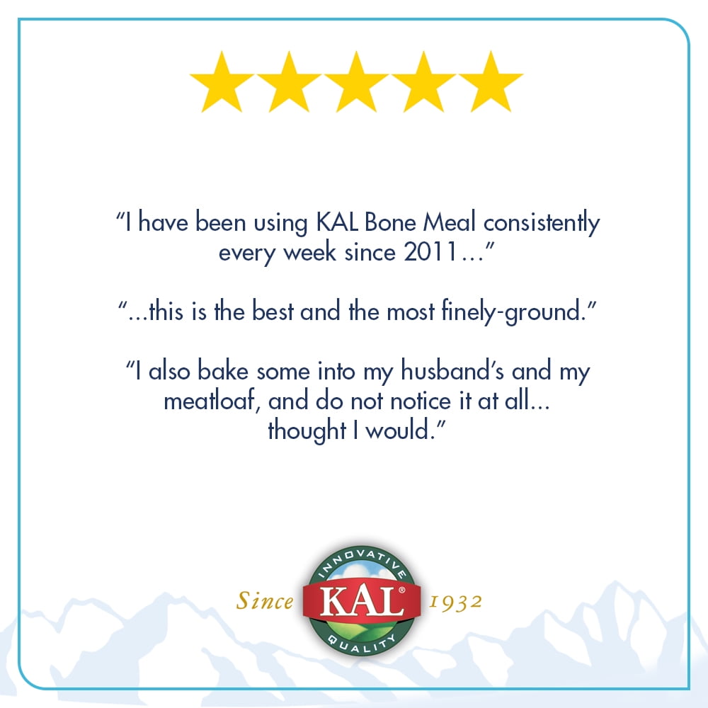 KAL Bone Meal is a whole food calcium source that provides 1300 mg Calcium, 440 mg Phosphorus, and 15 mg Magnesium per teaspoon (6g). Bone Meal is intended to provide nutritive support for healthy bones, teeth, nerve and muscular function.