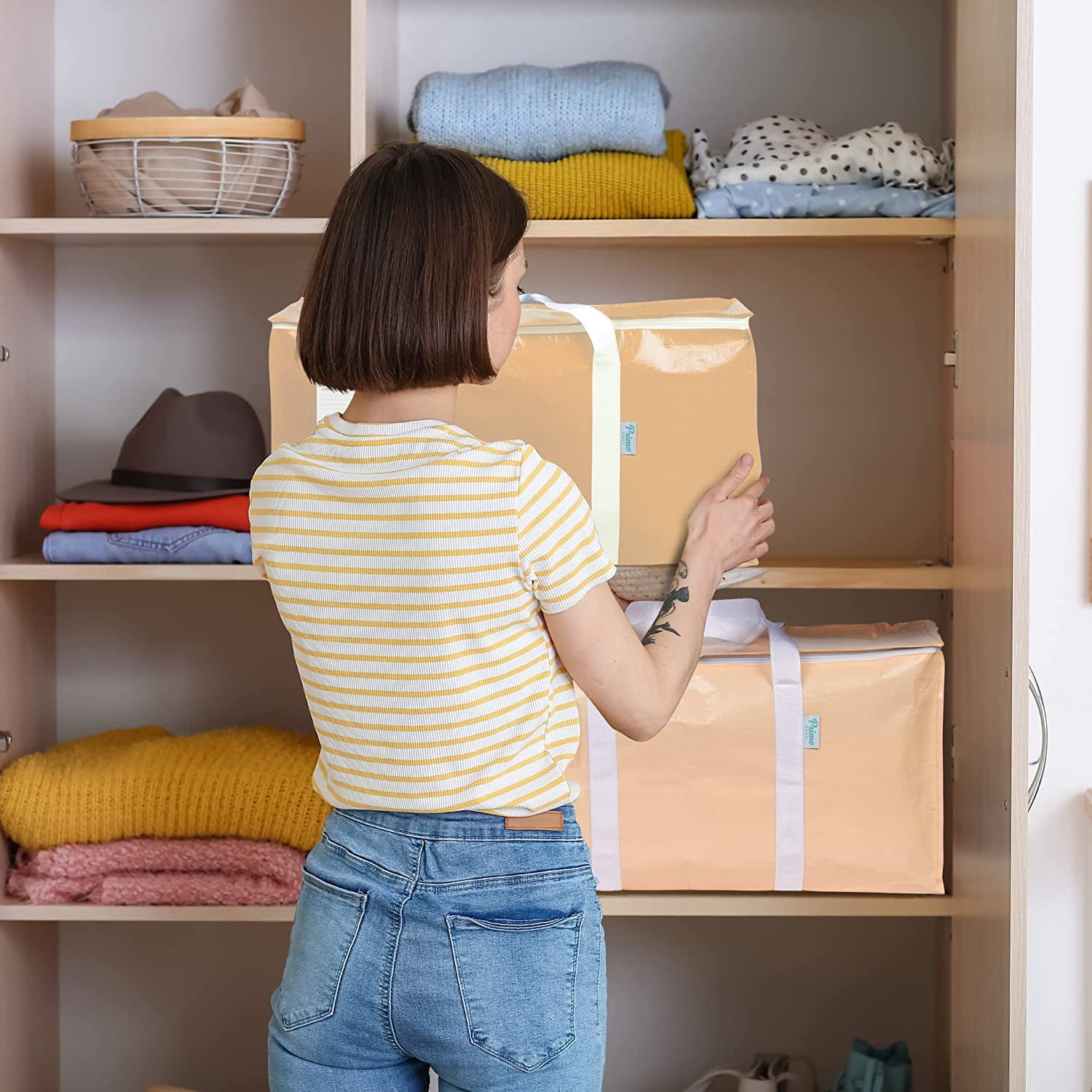 Primo Bags extra large moving and storage bags are perfect for moving, storing, and organizing any household items. These zippered heavy duty moving bags will allow you to quickly and easily pack and move a variety of miscellaneous items. No need to pack and tape boxes anymore when you have these easy to use collapsible moving and storage bags. They are perfect for short or long distance moves, are reusable, and fold flat when you are done using them. These totes for storage and moving will allow you to safely pack up to 50 pounds. They are more flexible than large plastic storage containers and storage bins which allows them to fit in tight spaces more easily. They are the perfect storage totes to pack seasonal items and store them in your closet, under your bed, or in your garage. They have a tag pocket at the top right corner where you can write the contents of the bag so that you can stay organized. These bags are also great for moving in and out of the college dorm, dorm storage, and as a laundry hamper or basket when not used for moving or storage.