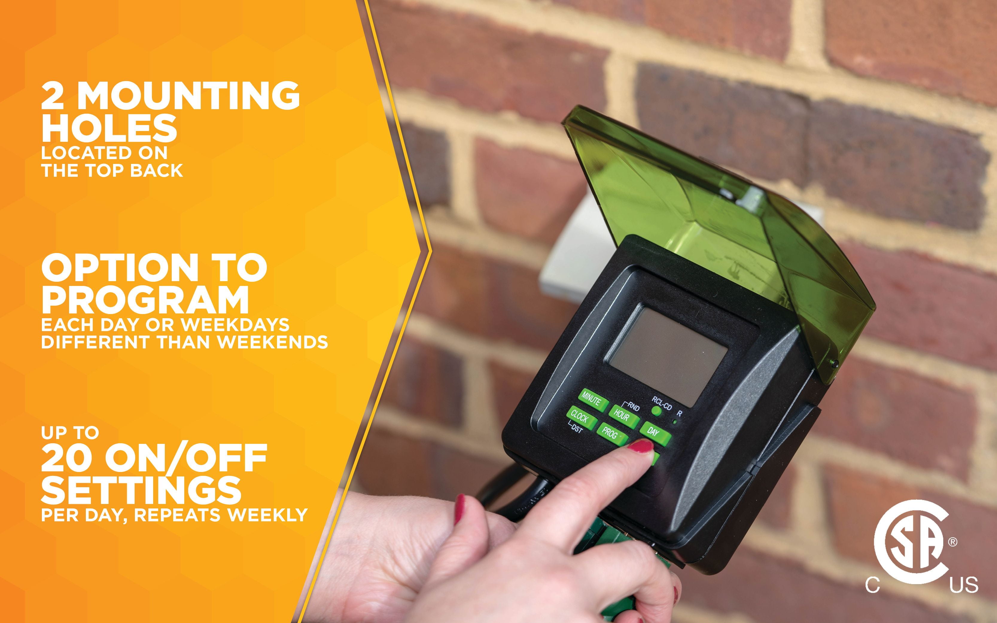- USER-FRIENDLY DIGITAL OUTLET TIMER: with 3 timing features (digital timer, random setting and countdown timer) on this 7-day programmable plug-in Green digital timer switch with 3-prong outlets, you can personalize your settings the way you like it for outdoor appliances; each day can also be programmed differently than the next, or weekends differently than weekdays, giving you more flexibility