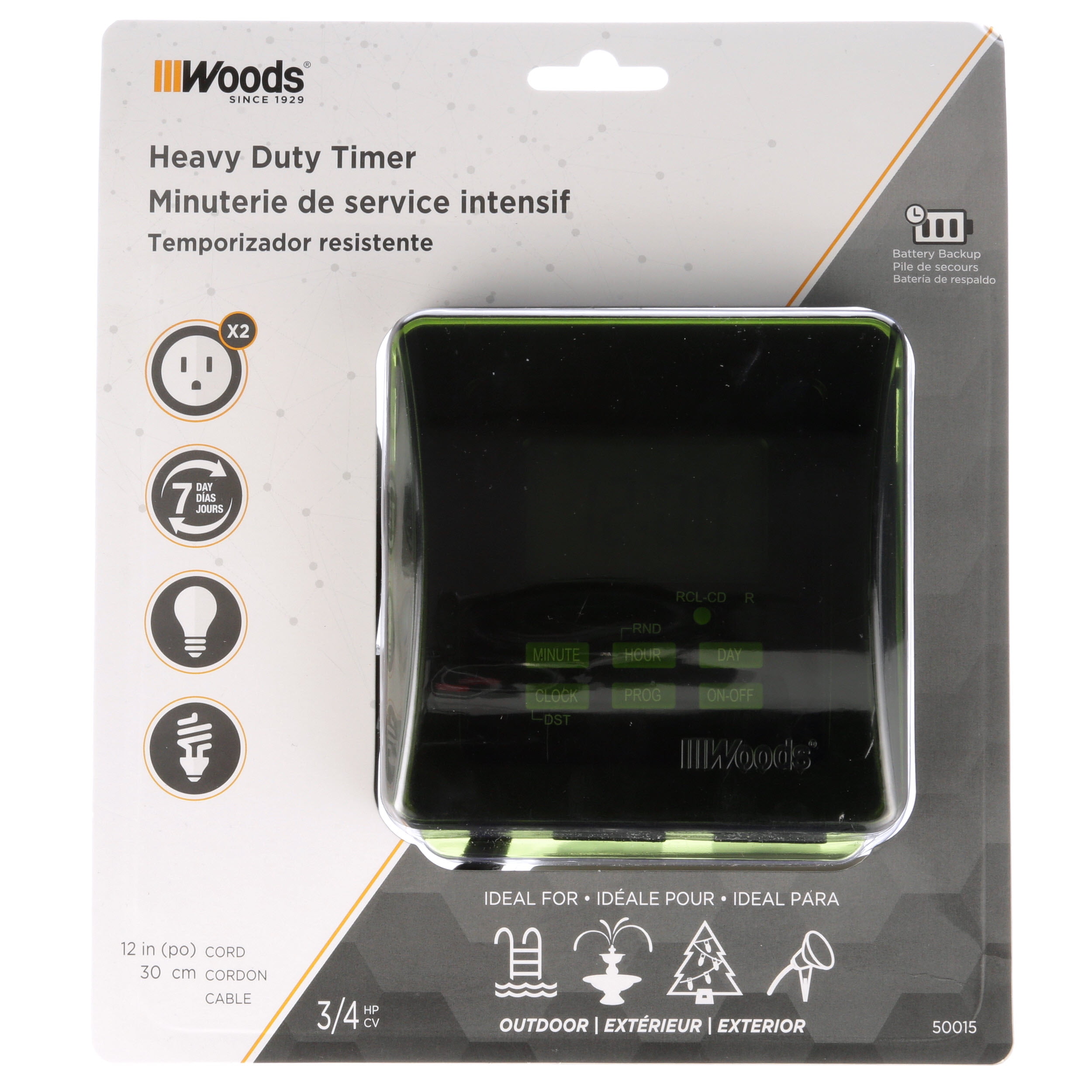 This Woods 50015 Green Outdoor 7-Day Heavy-Duty Digital Outlet Timer is ideal to use for a range of equipment. It features manual override, and the settings repeat daily. The Woods 50015 timer controls outdoor loads including fans and appliances. This item has a large easy-to-read LCD display, and you can simply change the settings anytime with the intuitive push-button interface. The timer also has a plastic cover for added protection outdoors and it comes complete with instructions. Our Company strives to deliver strong performance every day. We’ve built a culture that puts customer needs first, making us easy to do business with and placing us at the top of our customers list of suppliers.