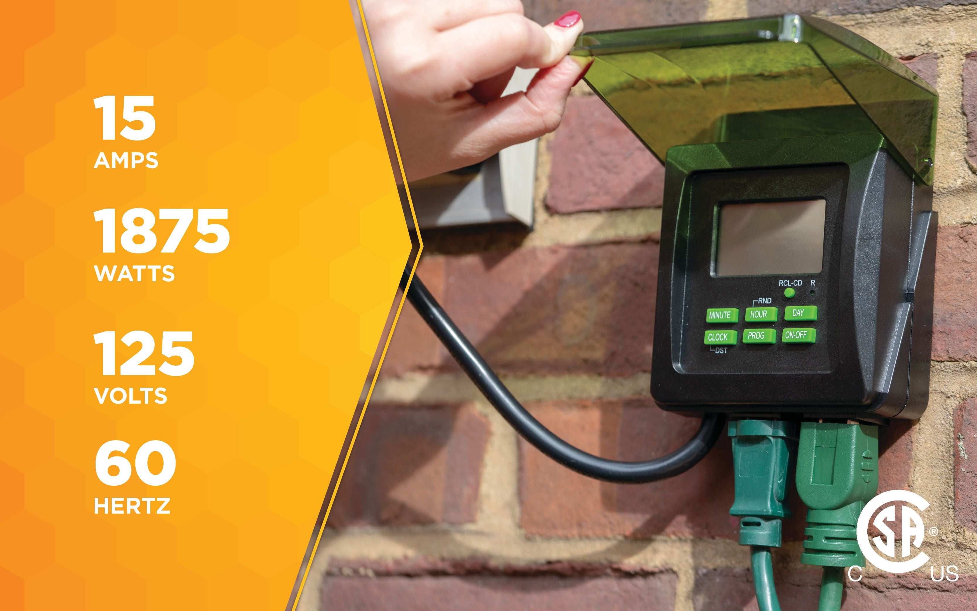 - WEATHERPROOF DIGITAL TIMER OUTLET SWITCH: this electrical outlet with digital timer has a hardy body and heavy-duty timer cover to protect it from the weather, dust and dirt. Total power outlets: 2: Operating frequency: 60 Hertz