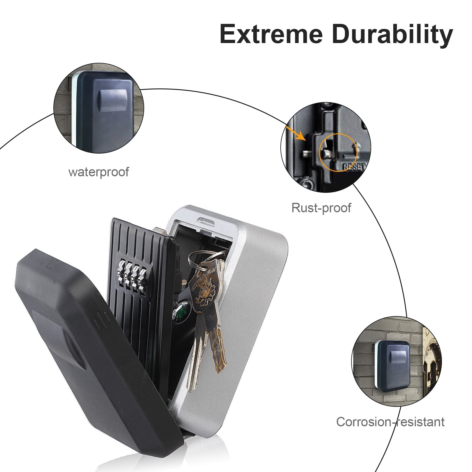 - Durable Lockable Key box: Our lockbox is built with high-grade rust and corrosion-resistant aluminum alloy, tough and sturdy enough that not easily deformed. Includes protective waterproof cover to hide and protect dials from dust, rust, sunlight, rain, and snow.