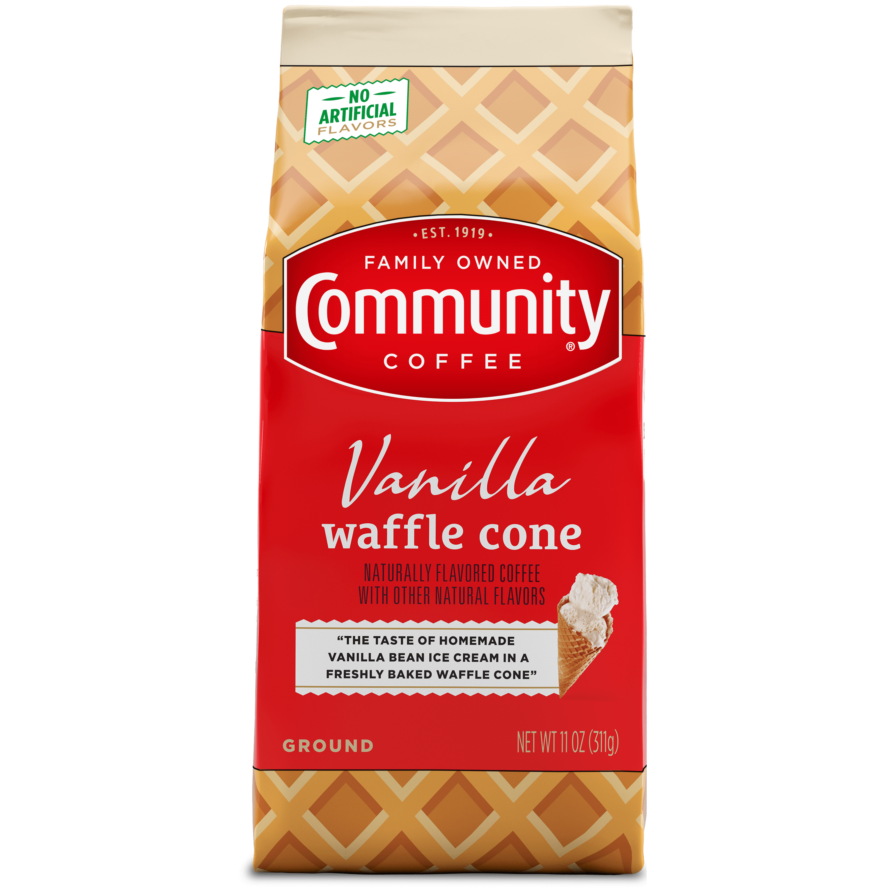 - Community Coffee Vanilla Waffle Cone is a naturally flavored coffee that creates a sweet, indulgent cup with a satisfying finish. This smooth, creamy treat embodies the reminiscent taste of homemade vanilla bean ice cream in a freshly baked waffle cone. To enhance the flavor, cream and add sugar.
