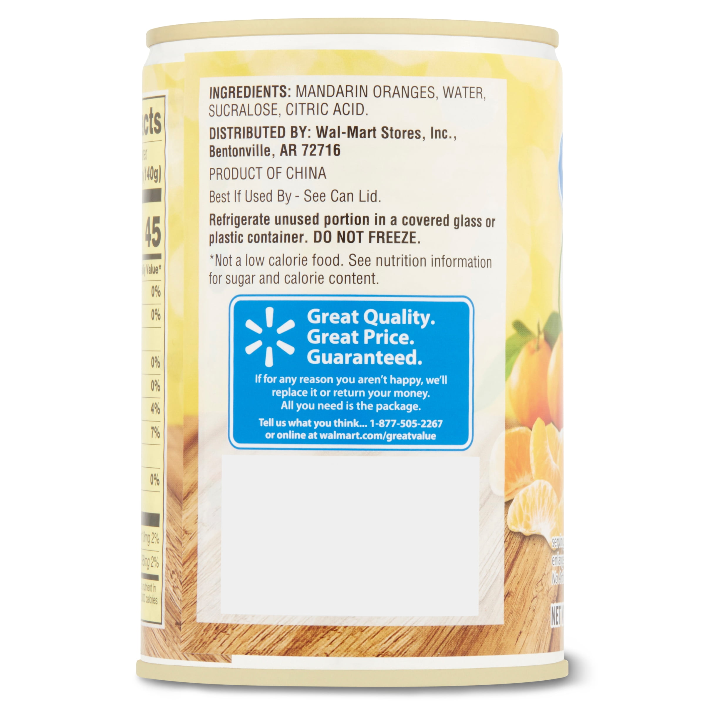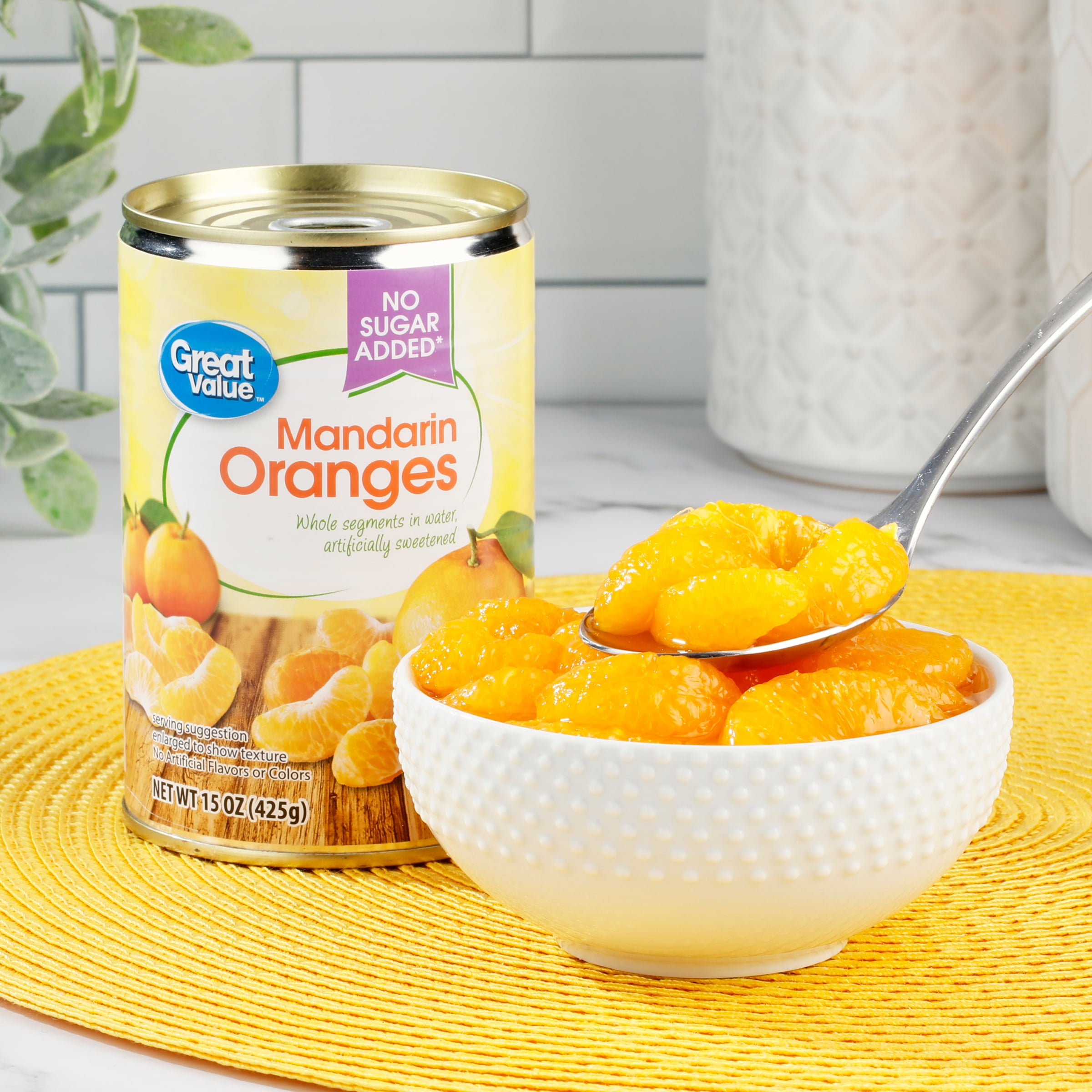 No sugar added**Not a low calorie food. See nutrition information for sugar and calorie content.Great Value Mandarin Oranges are the versatile way to brighten up your next meal or snack. Cut into whole segments and packed in water, these mandarin oranges can breathe new life into your ?go-to’ snacks such as yogurt or cottage cheese. Add a zesty flair to your next salad or put a colorful accent on your pineapple cake. With no added sugars, these mandarin oranges are an ideal low-calorie option for the health-conscious eater. With a delicious, sweet taste that’s impossible to resist, Great Value Mandarin Oranges will be your new favorite delicacy!Great Value products provide families with affordable, high quality grocery and household consumable options. With our wide range of product categories spanning grocery and household consumables, we offer you a variety of products for your family’s needs. Our products are conveniently available online and in Walmart stores nationwide, allowing you to stock up and save money at the same time.