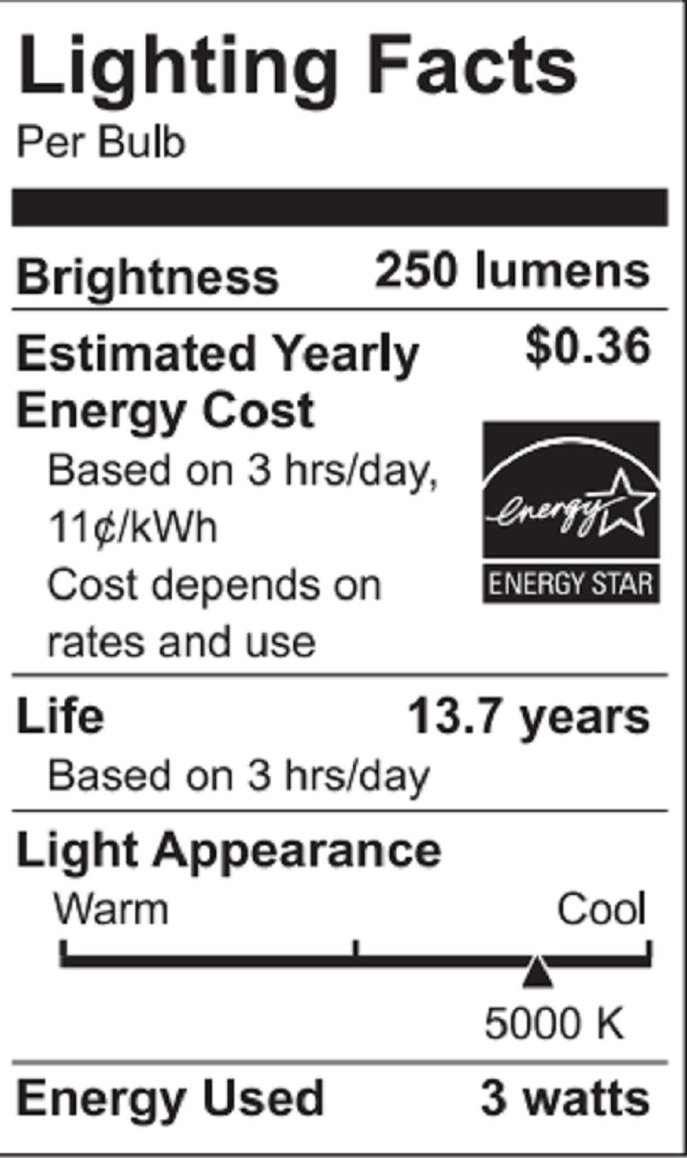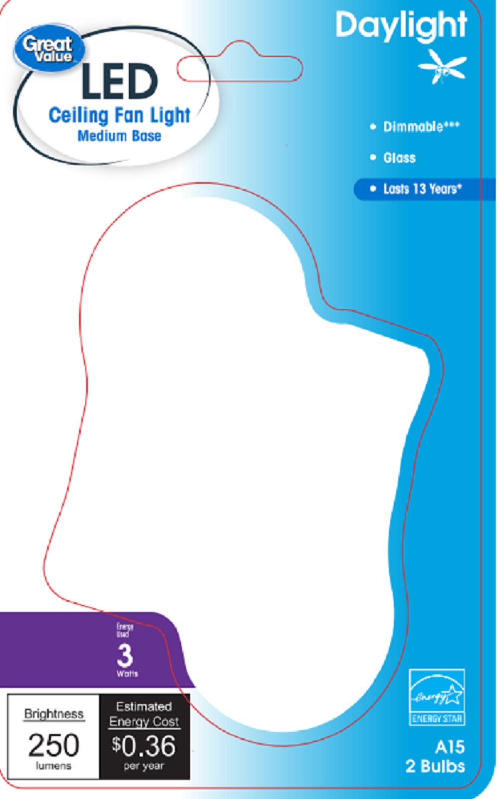 Illuminate your home with the Great Value LED A15 Bulbs. These lights draw only 2.5 watts which is equivalent to the 25 watts a regular incandescent bulb would draw making them ecofriendly. They boast an estimated energy cost of $0.30 per year, have a brightness of 250 lumens and can last up to 13 years, so you can keep your home bright and well-lit for years to come. They are dimmable, feature a medium base, and have a daylight color temperature for a bright and illuminating glow. The bulbs are suitable for wall sconces, chandeliers, and more. Each pack comes with two light bulbs, great for multiple light fixtures or stocking up. Make sure your home is well-lit with the Great Value LED A15 bulbs. Great Value products provide families with affordable, high quality grocery and household consumable options. With our wide range of product categories spanning grocery and household consumables, we offer you a variety of products for your family’s needs. Our products are conveniently available online and in Walmart stores nationwide, allowing you to stock up and save money at the same time.