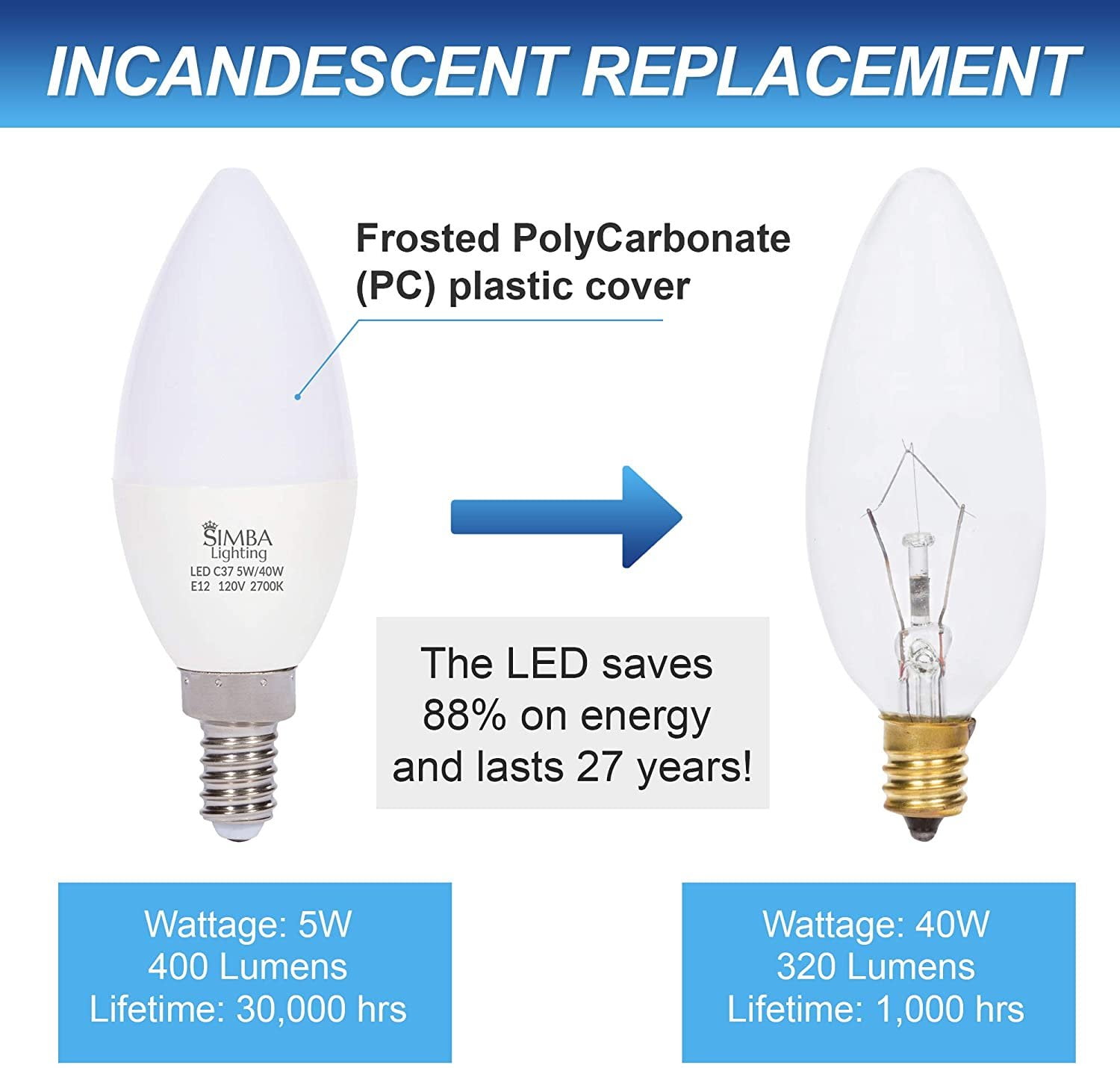 This LED light bulb takes 5W, yet giving 400 lumens of light, which is equivalent to 40W of incandescent light output. Thats 88% power savings! Assuming an average of 3 hours of daily operation and average cost of 11 cents per kW, the yearly energy cost is reduced from $4.8 to only $0.6!