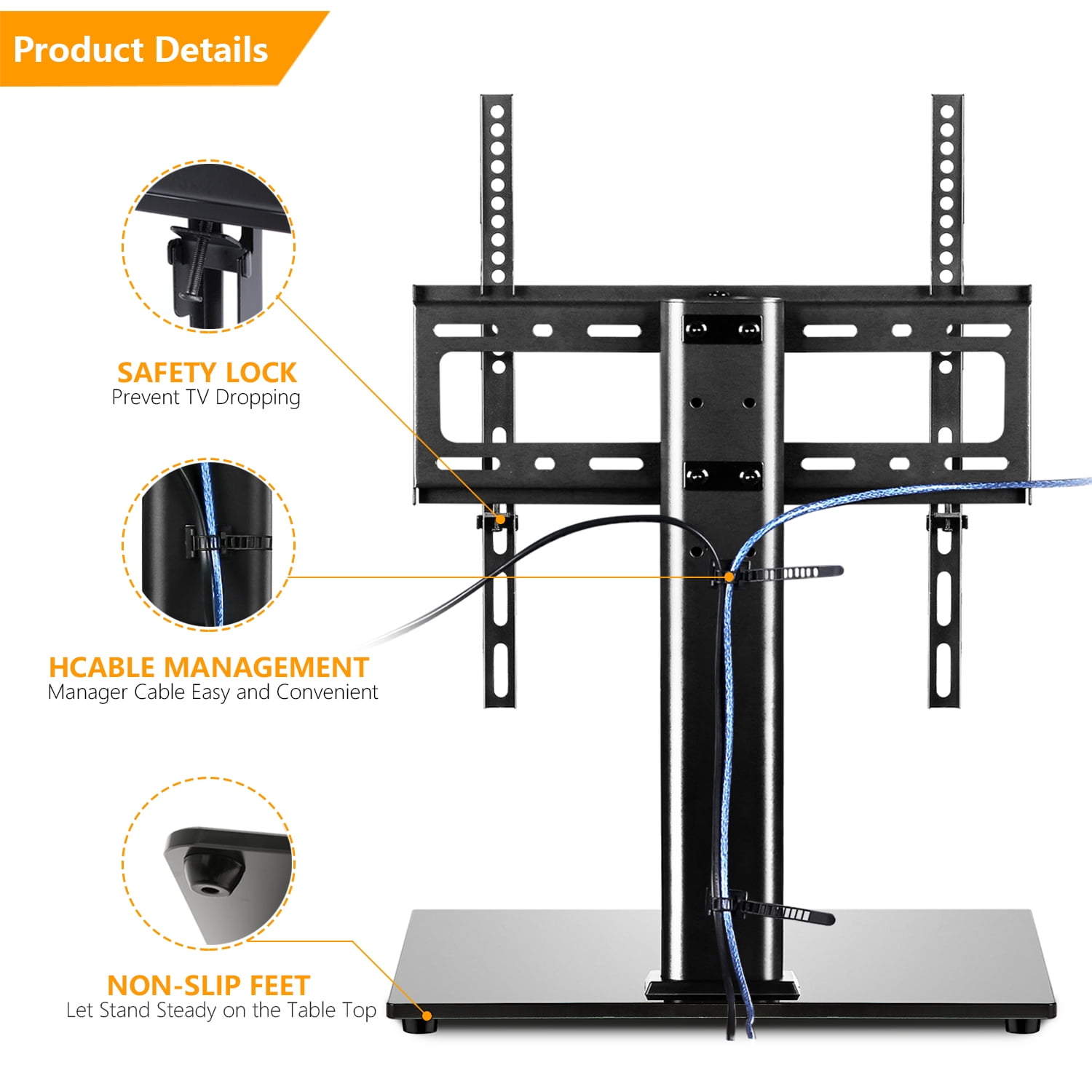 Universal Table Top TV Stand for TVs up to 55′, Swivel TV Mount Black Glass Base