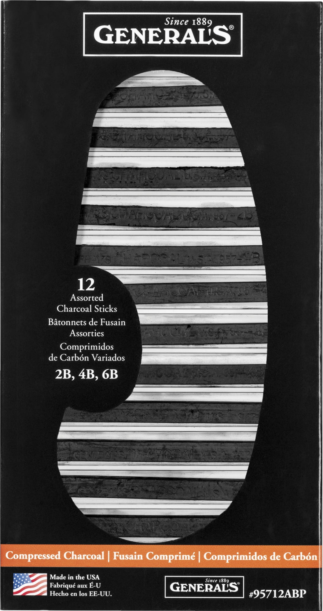 Generals 95712ABP Compressed Charcoal Assortment, Assorted Tip, 1/4′ x 3′ Size, Black