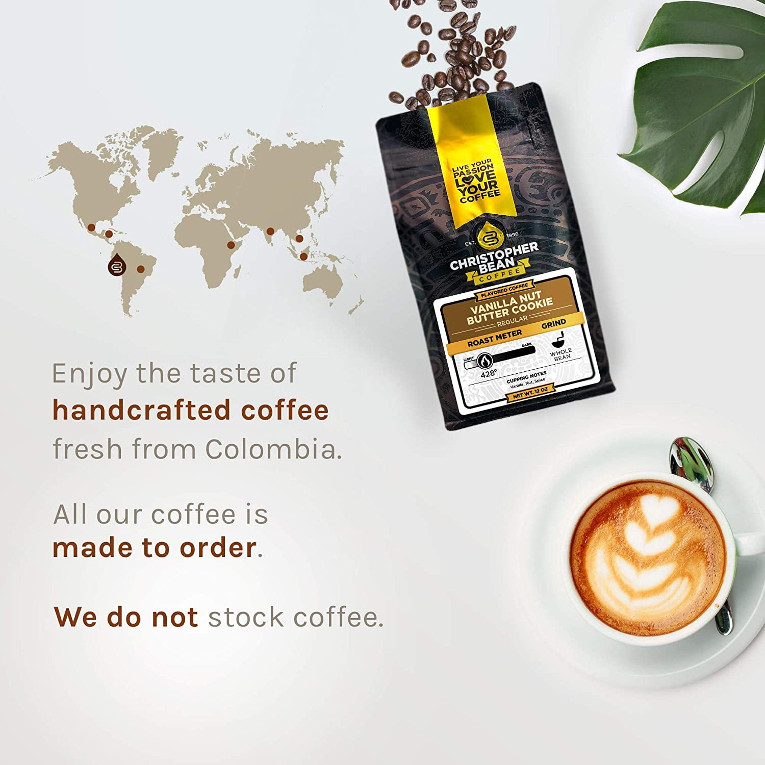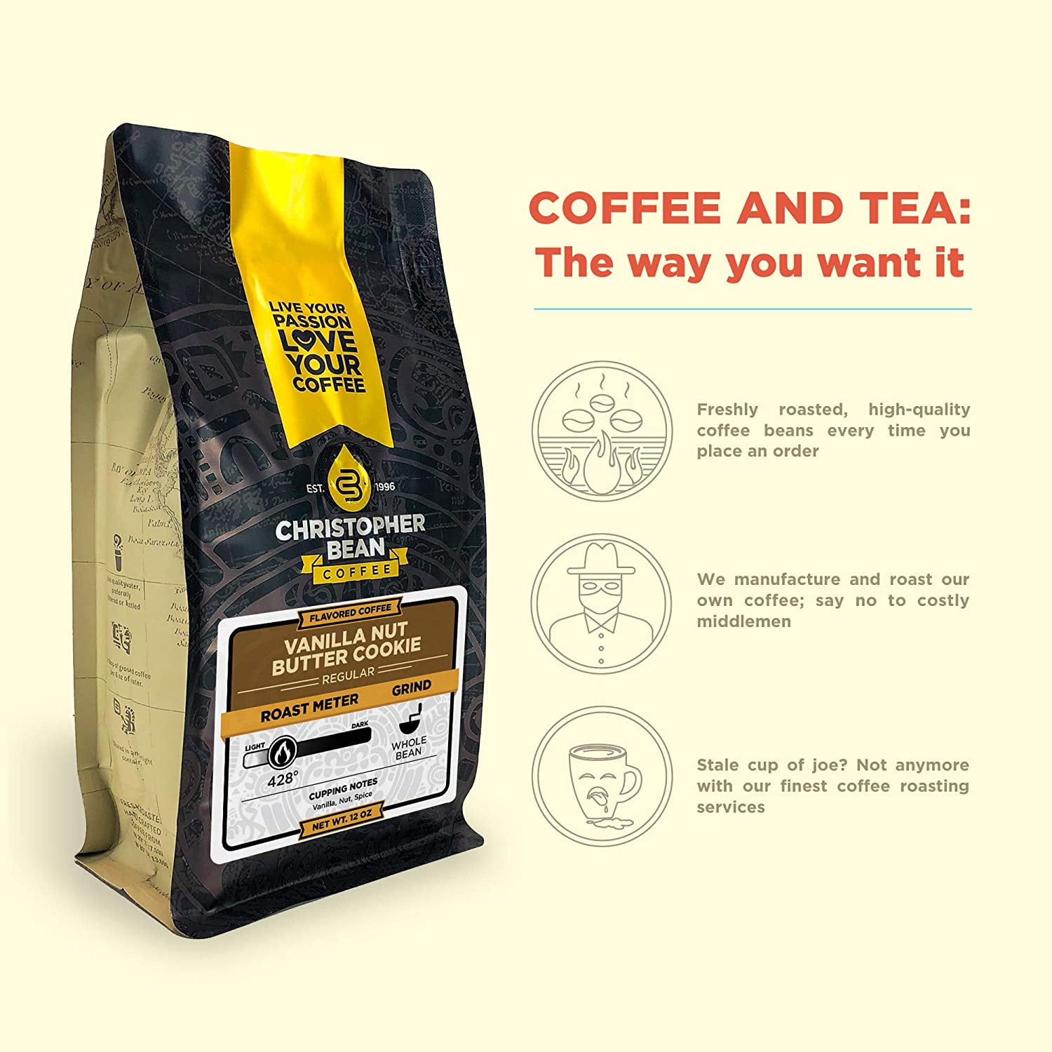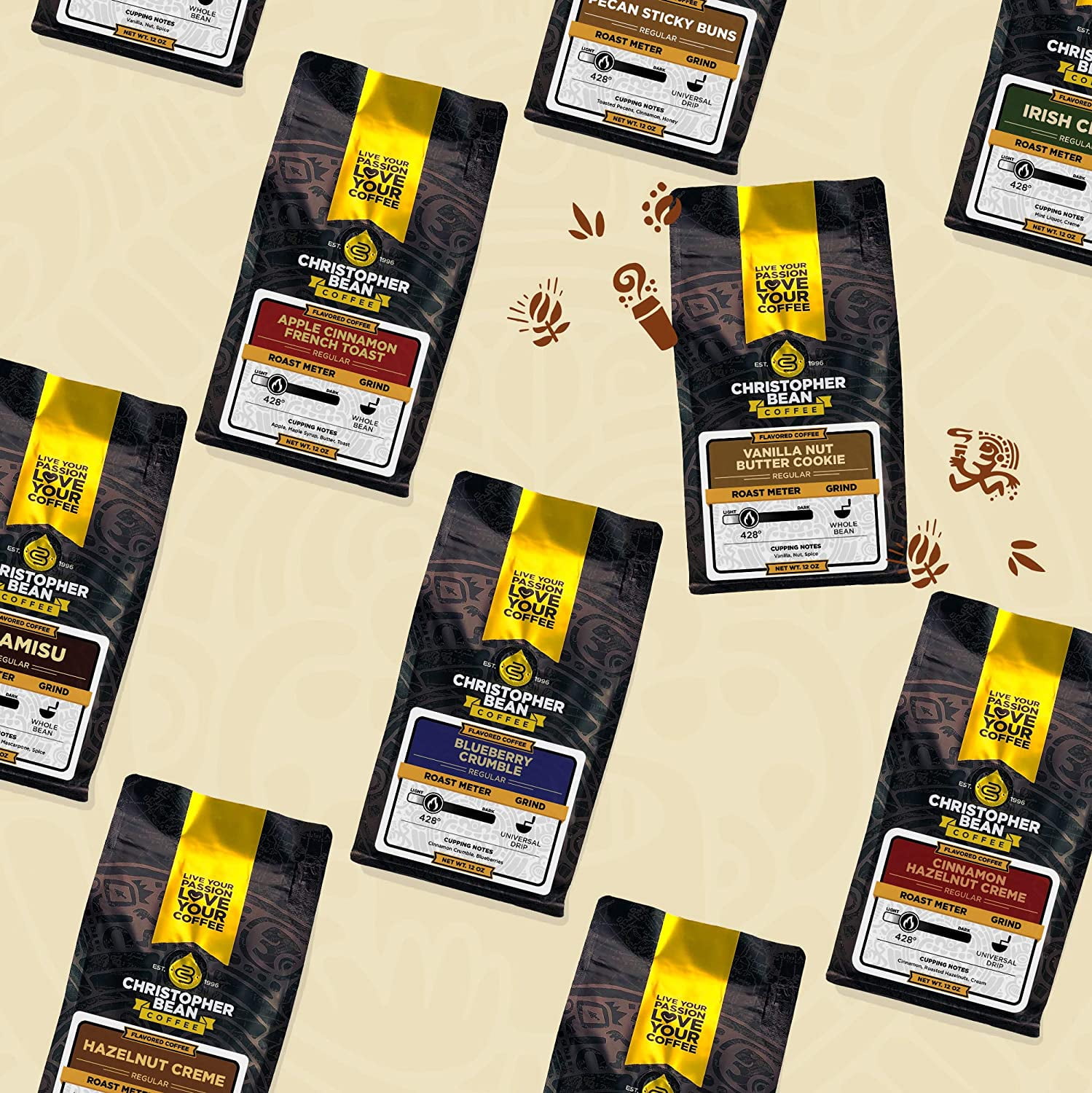 - 100% Arabica Coffee; Comes with the Christopher Bean Fresh Roast Guarantee; Always roasted to order; One 12 ounce bag of flavored coffee; Available in whole bean, ground, and percolator coarse; Available in regular or decaffeinated; Sugar-free; Fat-free; Only Non-GMO flavorings are used