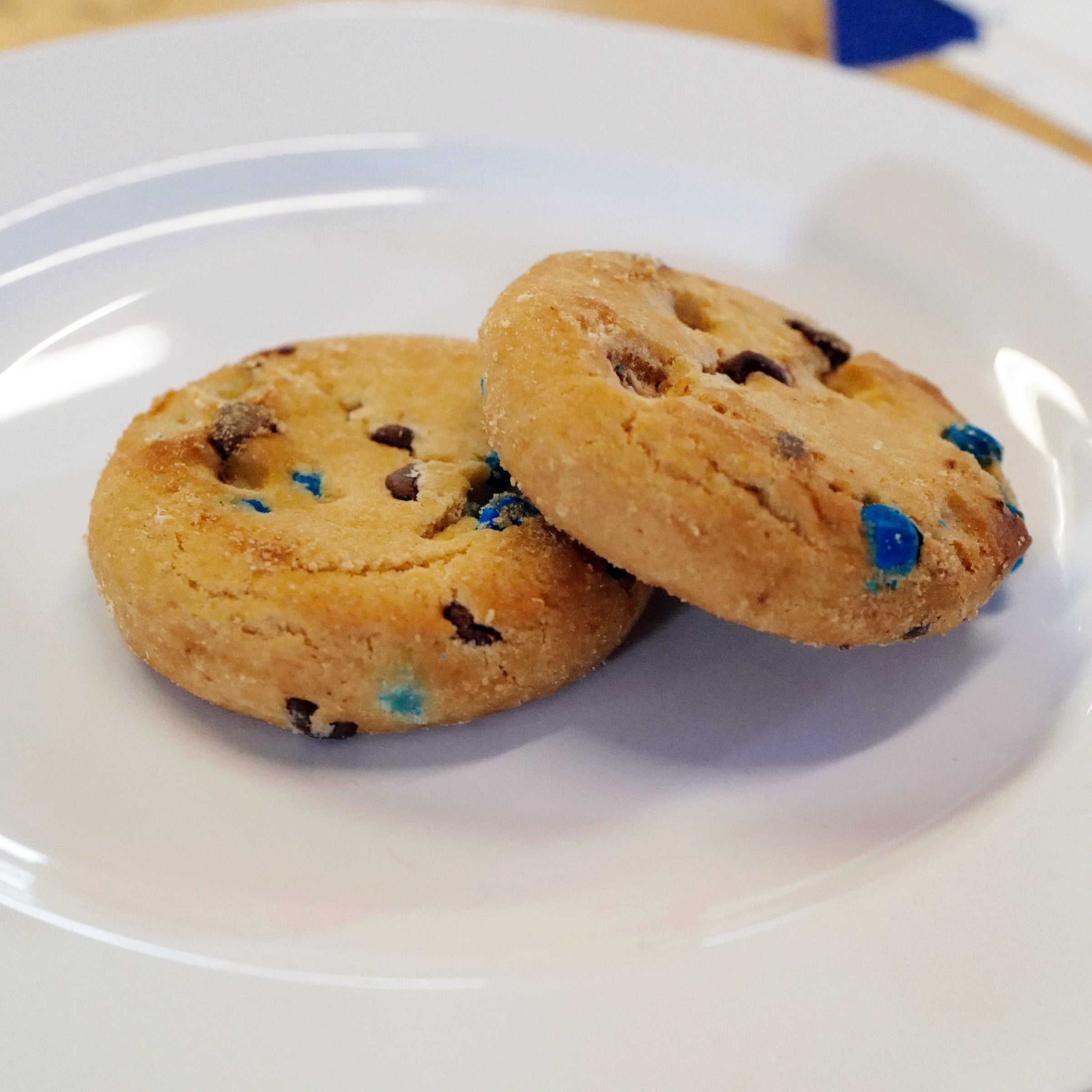 - Crunchy chocolate chip cookies with blue candy coated pieces
