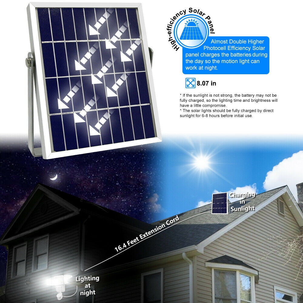 The Solar lights It powered by Solar panel, very Energy-saving, And super-bright white 1000 Lumens LEDs ensuring reliable lighting power, it’s triple LED head newly designed light offers adjustable side lamp heads for maximum lighting coverage any dark area, sensor light automatically turns on when motion is detected sensitively comes equipped for security