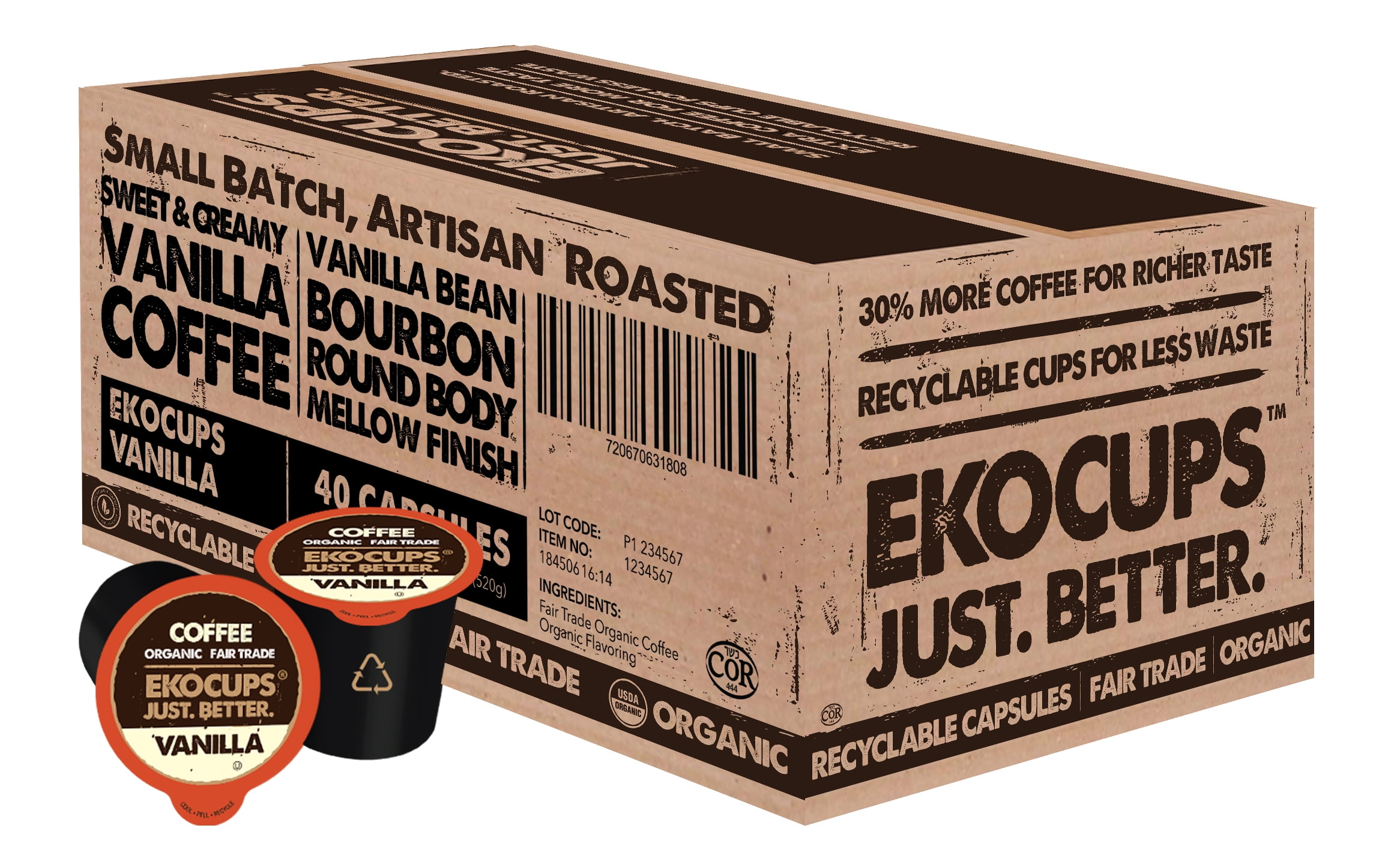 - 100% USDA Certified Organic, and Fair Trade artisan dark roast gourmet coffee in recyclable capsules. 13g of coffee packed into our Ekocups, 30% more coffee per cup than the average brand of single serve cups, for a richer cup of coffee that just tastes better.
