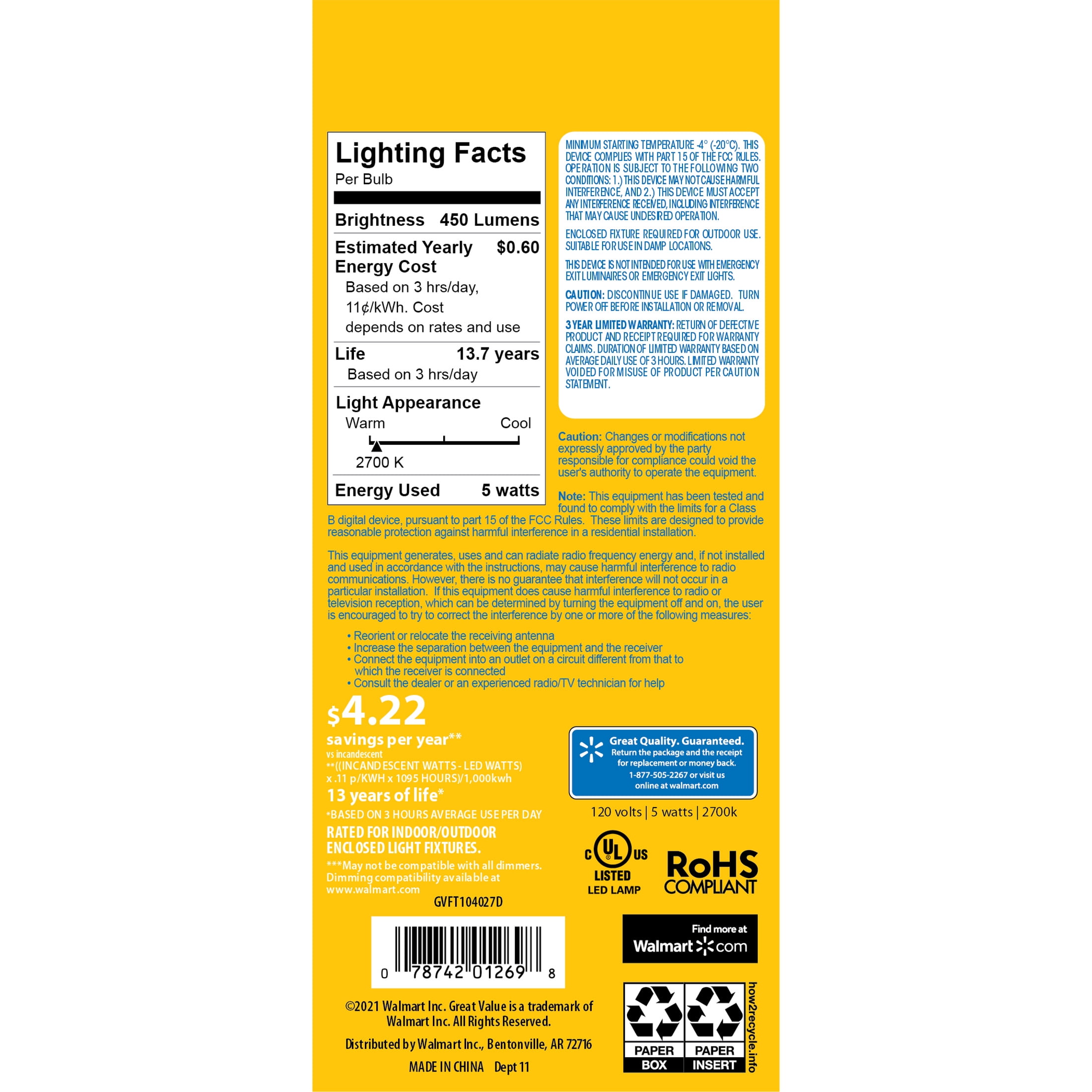 Great Value LED light bulbs are a great way to save money on energy costs. Built for durability, the solid structure of the LED bulbs will outlast any incandescent bulb while using up to 80% less energy. They provide excellent light quality while helping you to save money and will last for years so you won’t have to constantly replace your light bulbs anymore.