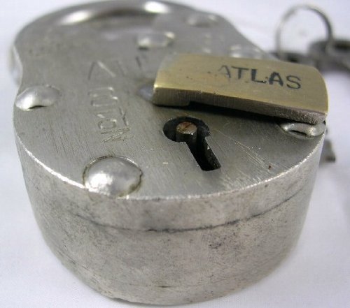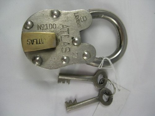 Large Atlas Replica PadlockUnique decorative and functional replicaThis "beefy" lock comes with two keysThe following is engraved on the front of the lock…"8 LEVERS", "21", "ATLAS" and "No100"The padlock measures 4-1/8"H x 2-1/4"W x 1"D
