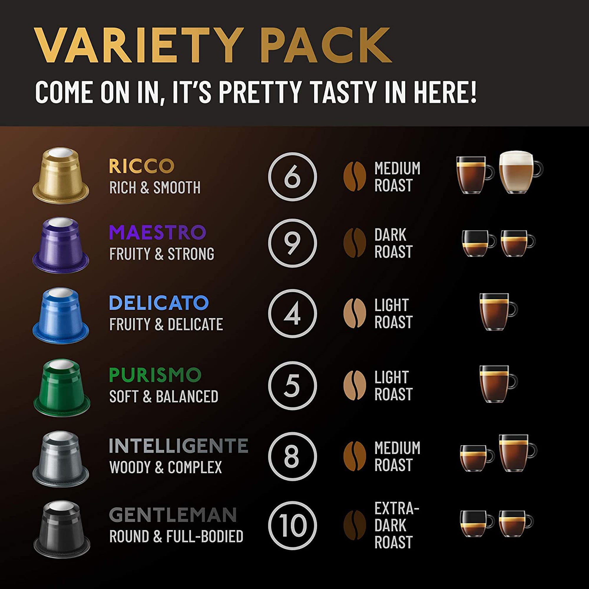 - 60 CAPSULES – SIX FLAVORS – Our variety pack (60 pods) gives you a taste of everything so you can decide on your favorite flavor yourself. With no two espresso blends quite the same you can sample the different profiles and aromas to enjoy every day. Flavor pack contains – Ricco, rich and smooth – Maestro, fruity and strong – Delicato, fruity and delicate – Purismo, soft and balanced – Intelligente, woody and complex – Gentleman, round and full-bodied.